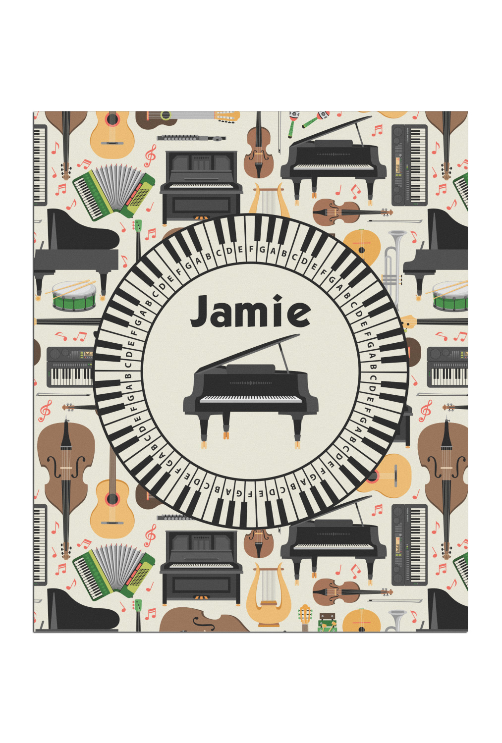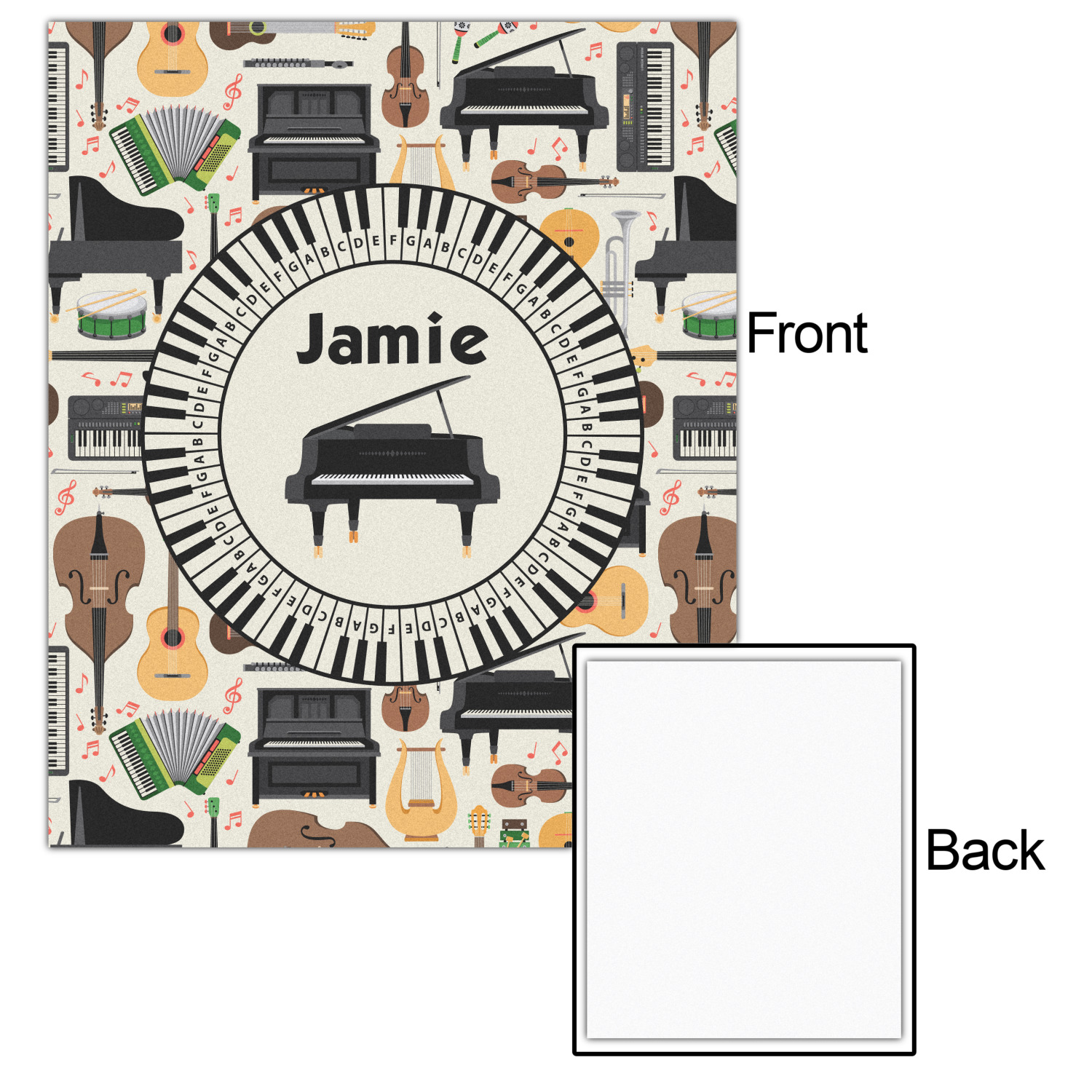 The background in the design is part of a set of music backgrounds - so it can easily be swapped out for a different background. We have a number of other musical frames / labels that you can also choose from. For the center graphic, all the musical instruments are in our system, so you can easily switch out the instrument.
