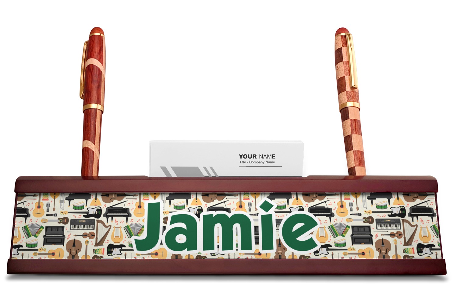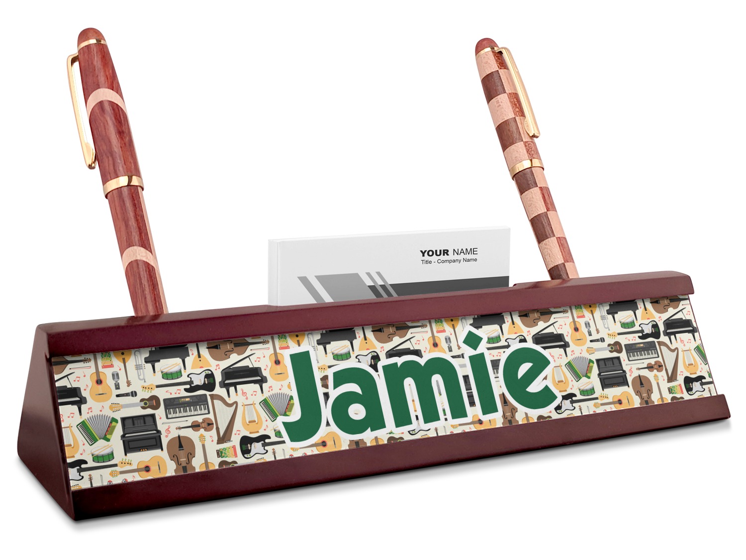 Your desk name plates are crafted from a high-quality, dark-cherry mahogany. At approximately 9.5 by 1.875 by 2.5 inches, this name plaque will fit perfectly, front and center, on your desk. Your customization spans across the entire face of the nameplate. Behind the nameplate lies a skinny slot that can fit approximately 15, traditionally-sized, business cards. You can also store your writing utensils on either side of this custom desk name plate.
