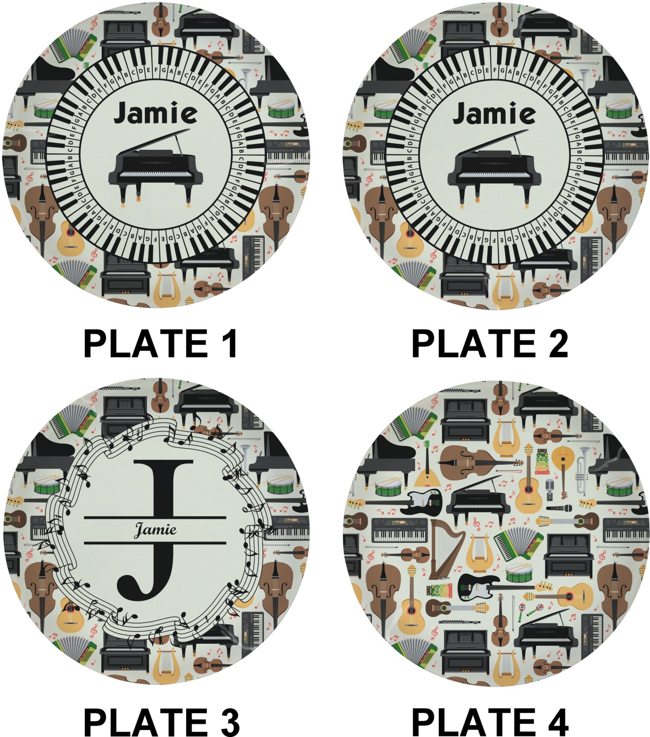The background in the design is part of a set of music backgrounds - so it can easily be swapped out for a different background. We have a number of other musical frames / labels that you can also choose from. For the center graphic, all the musical instruments are in our system, so you can easily switch out the instrument.