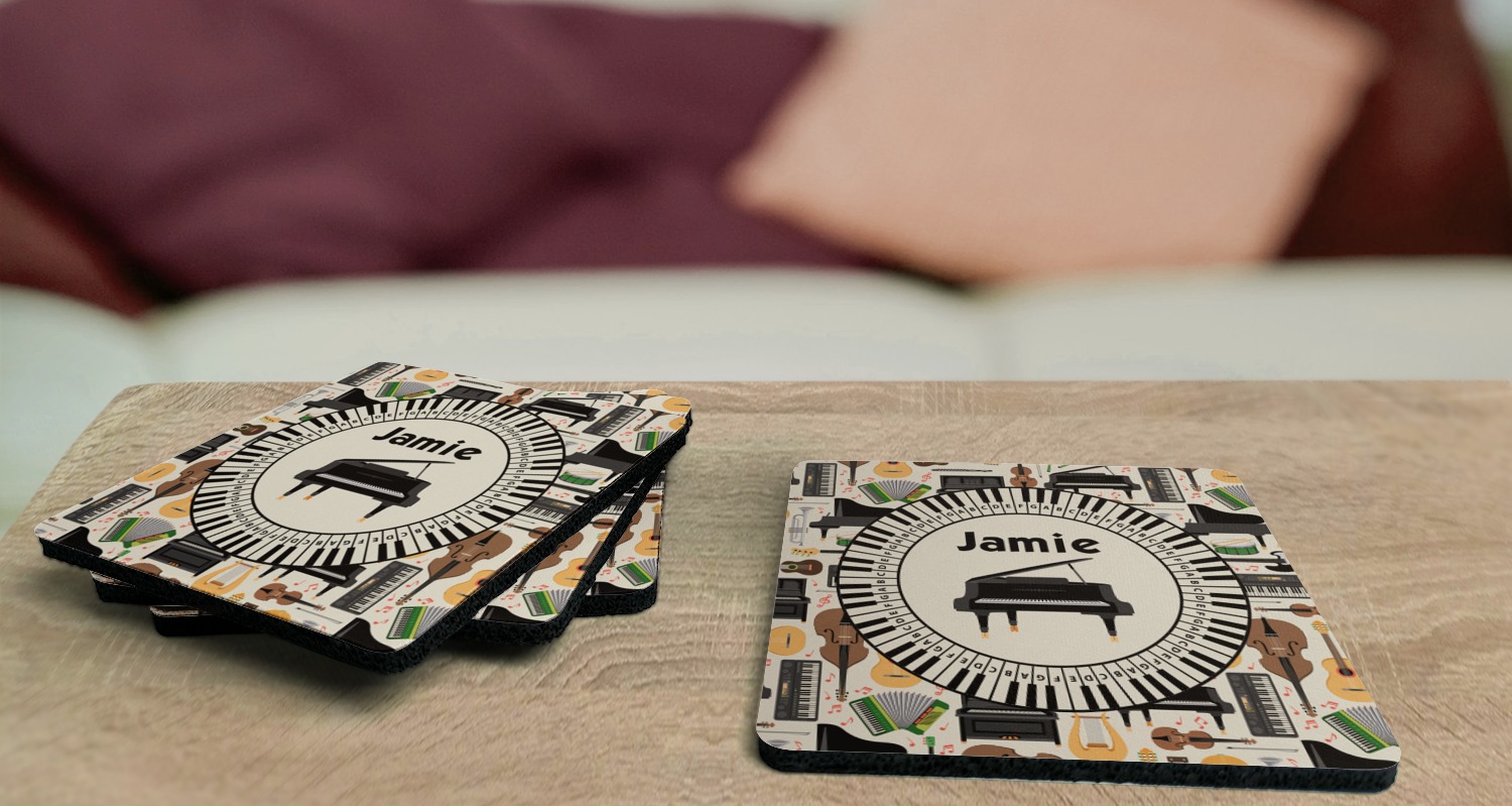 These drink coasters have a smooth, polyester top and a textured, rubber backing on its bottom. The non-slip rubber backing underneath works to keep any spills at bay. At 4 by 4 by 0.25 inches thick, these custom coasters are a suitable size for most drinkware. Your personalization is displayed atop the face of the cup coaster. We sell these rubber coasters in two different shapes: square and round. You can buy each shape as singulars or as a set of 4.