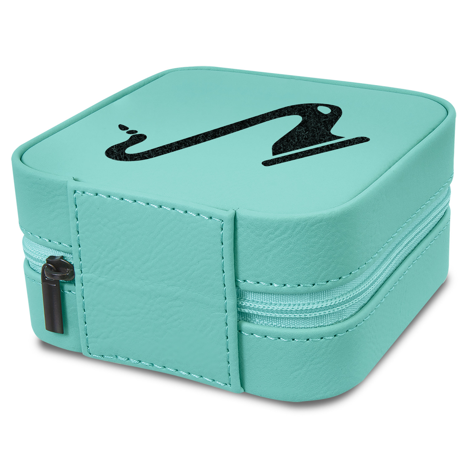 This square zippered travel jewelry box is made from leatherette and is available in four colors - classic cognac / rawhide, a beautiful teal. navy blue or pink. The tan colored soft velvet inside has compartments and hooks for all your jewelry - rings, chains, earrings, bangles etc.