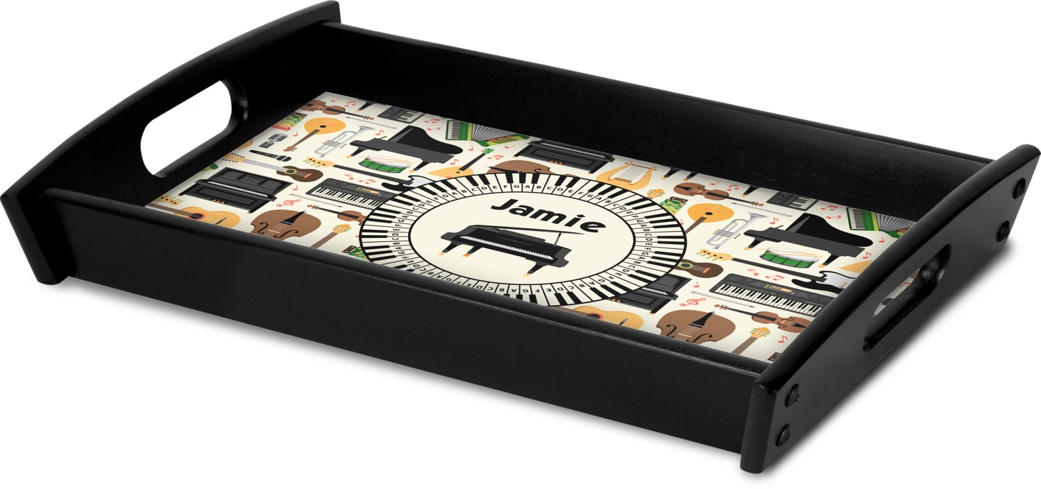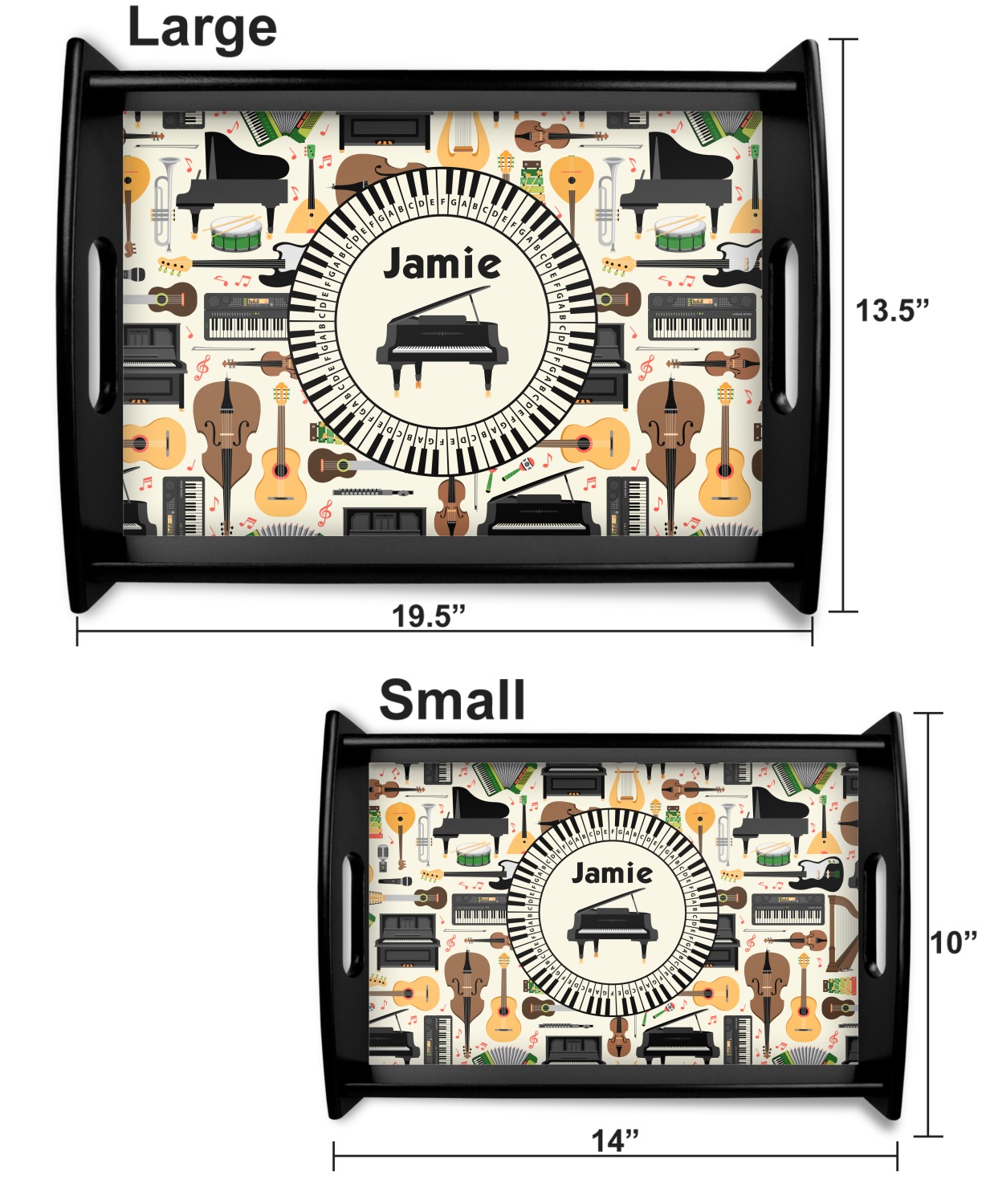 This serving tray with handles features square edges and two rounded sides, creating a very modern look. Each side is fabricated from a beautifully cut, natural wood. The bottom of the interior of the tray displays your customized design in bright, vibrant color. The tray is sold in both a black color and a natural wood look. Each variation of the wood serving tray has two sizes: Small, which is 14" x 10" x 2.25", and Large, which is 19.5" x 13.5" x 2.75".