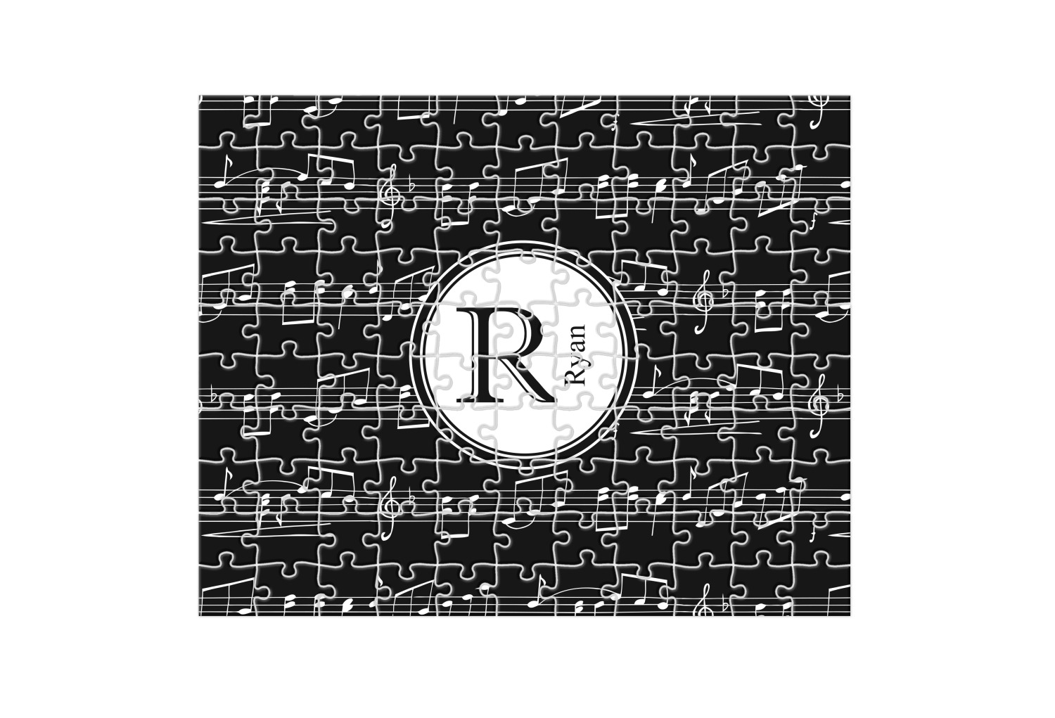 Music notes are set on a white background just like a sheet of music. A simple black outlined white label is placed in the middle of the design. Personalize with an initial and name of your choice.