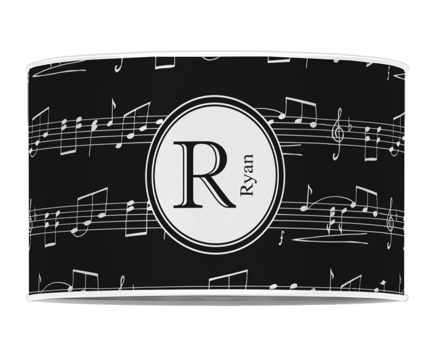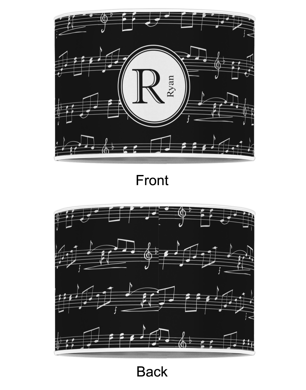 Music notes are set on a white background just like a sheet of music. A simple black outlined white label is placed in the middle of the design. Personalize with an initial and name of your choice.