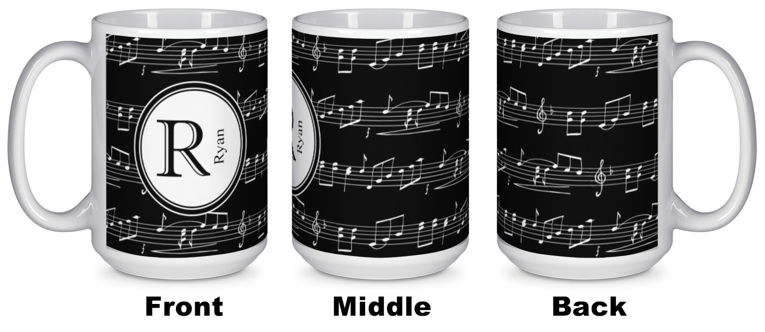 Music notes are set on a white background just like a sheet of music. A simple black outlined white label is placed in the middle of the design. Personalize with an initial and name of your choice.