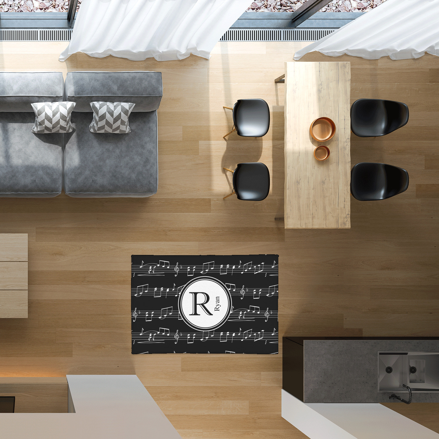 Music notes are set on a white background just like a sheet of music. A simple black outlined white label is placed in the middle of the design. Personalize with an initial and name of your choice.
