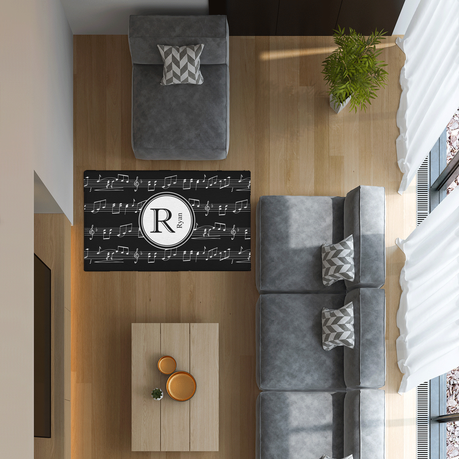 Music notes are set on a white background just like a sheet of music. A simple black outlined white label is placed in the middle of the design. Personalize with an initial and name of your choice.