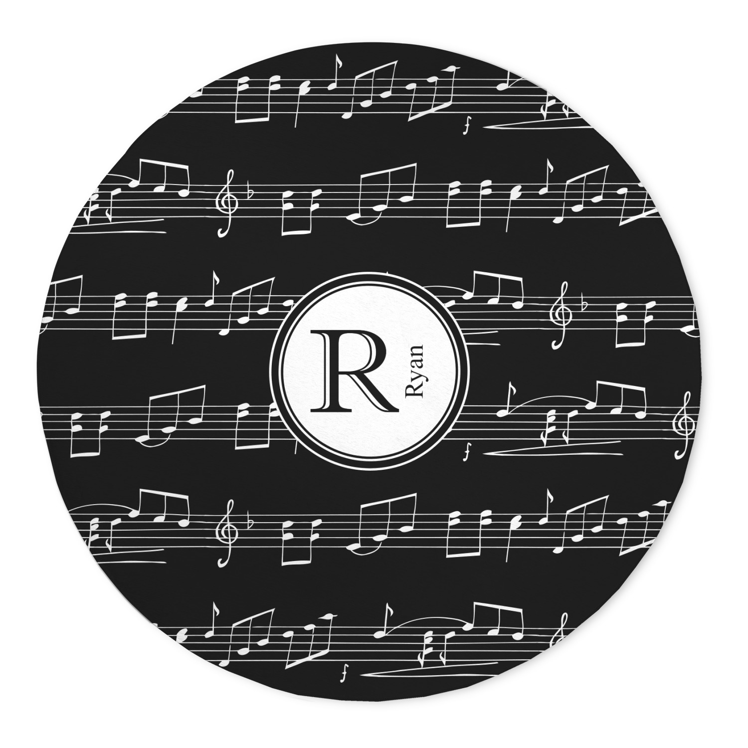 Music notes are set on a white background just like a sheet of music. A simple black outlined white label is placed in the middle of the design. Personalize with an initial and name of your choice.