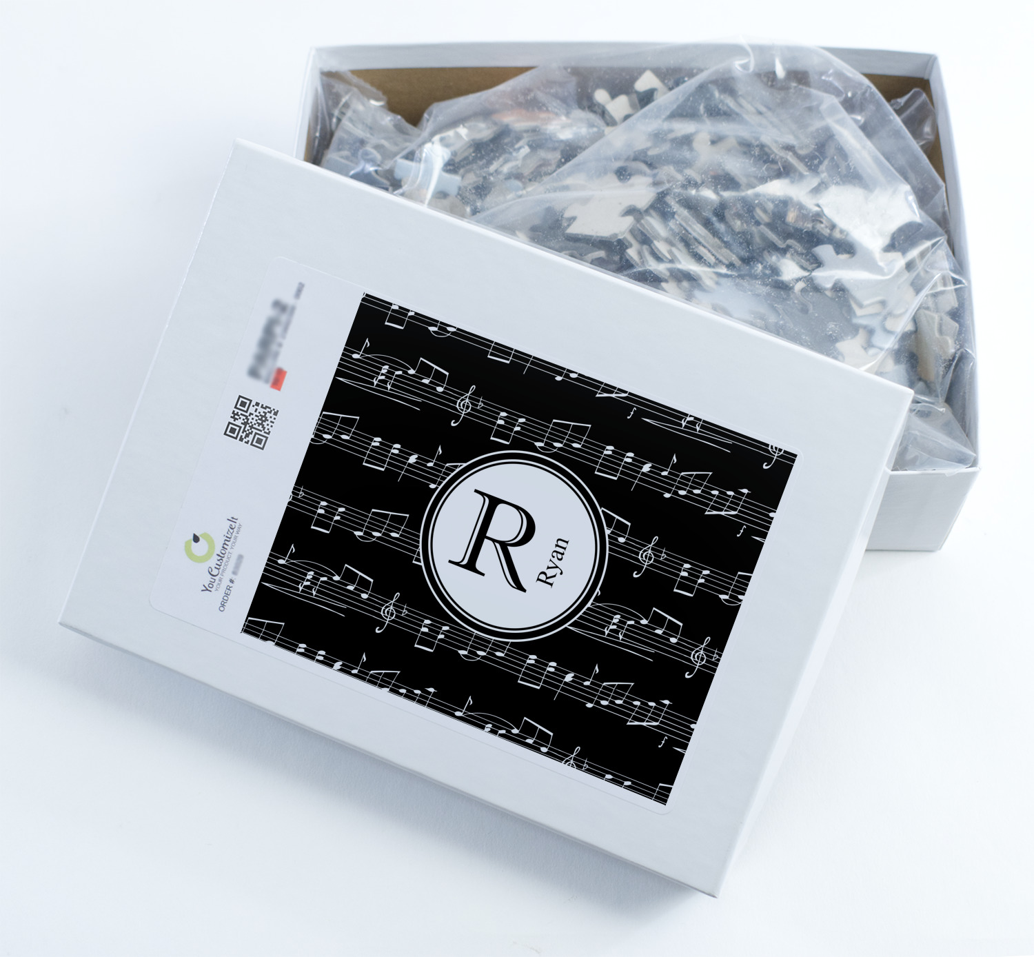 Music notes are set on a white background just like a sheet of music. A simple black outlined white label is placed in the middle of the design. Personalize with an initial and name of your choice.