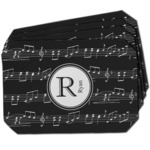 Music notes are set on a white background just like a sheet of music. A simple black outlined white label is placed in the middle of the design. Personalize with an initial and name of your choice.