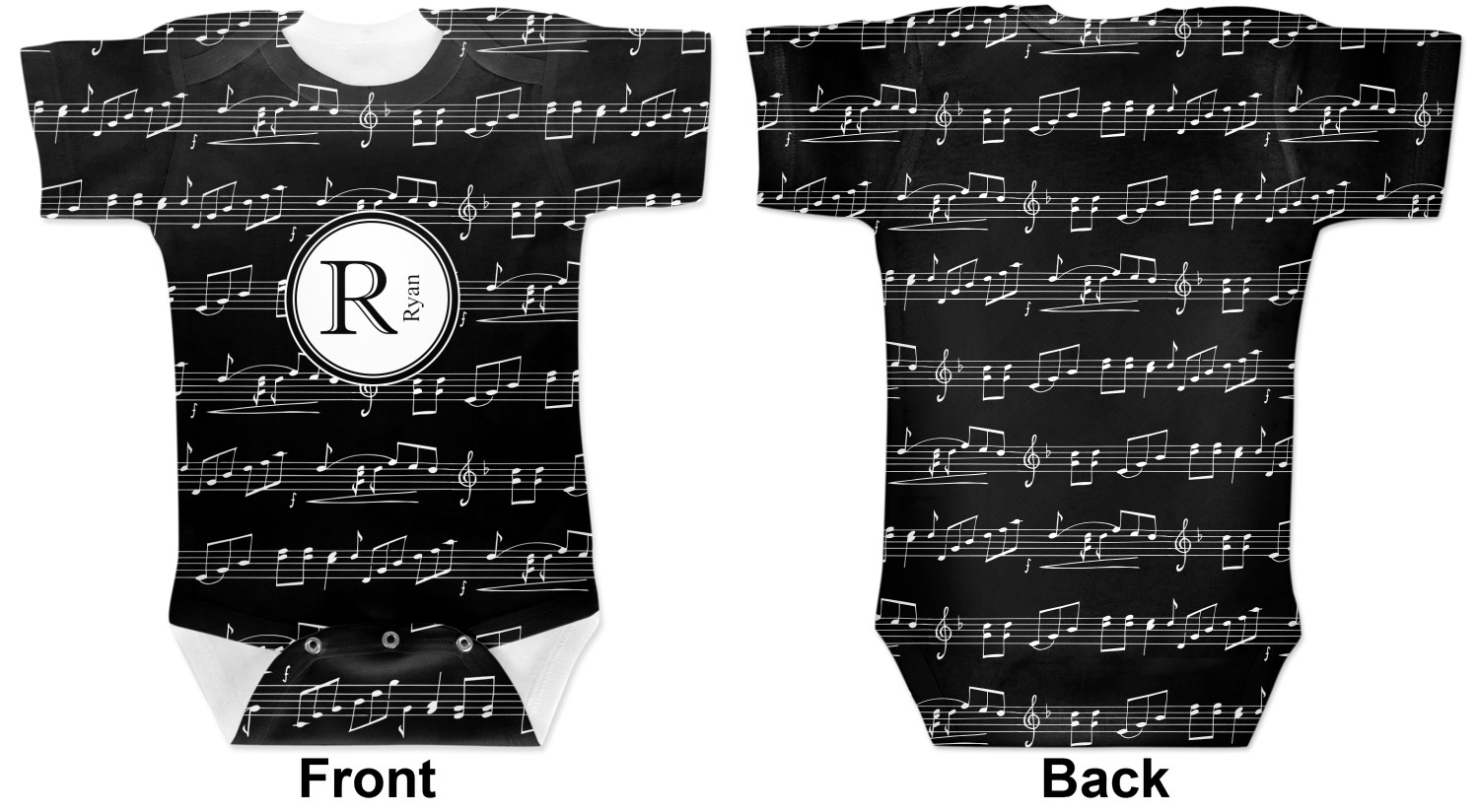 Music notes are set on a white background just like a sheet of music. A simple black outlined white label is placed in the middle of the design. Personalize with an initial and name of your choice.