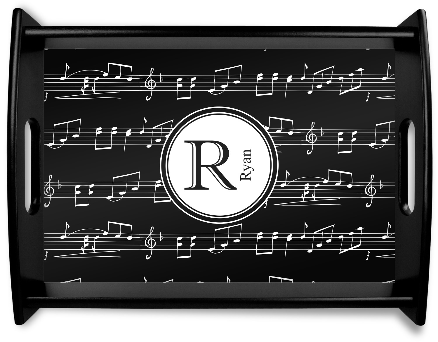 Music notes are set on a white background just like a sheet of music. A simple black outlined white label is placed in the middle of the design. Personalize with an initial and name of your choice.