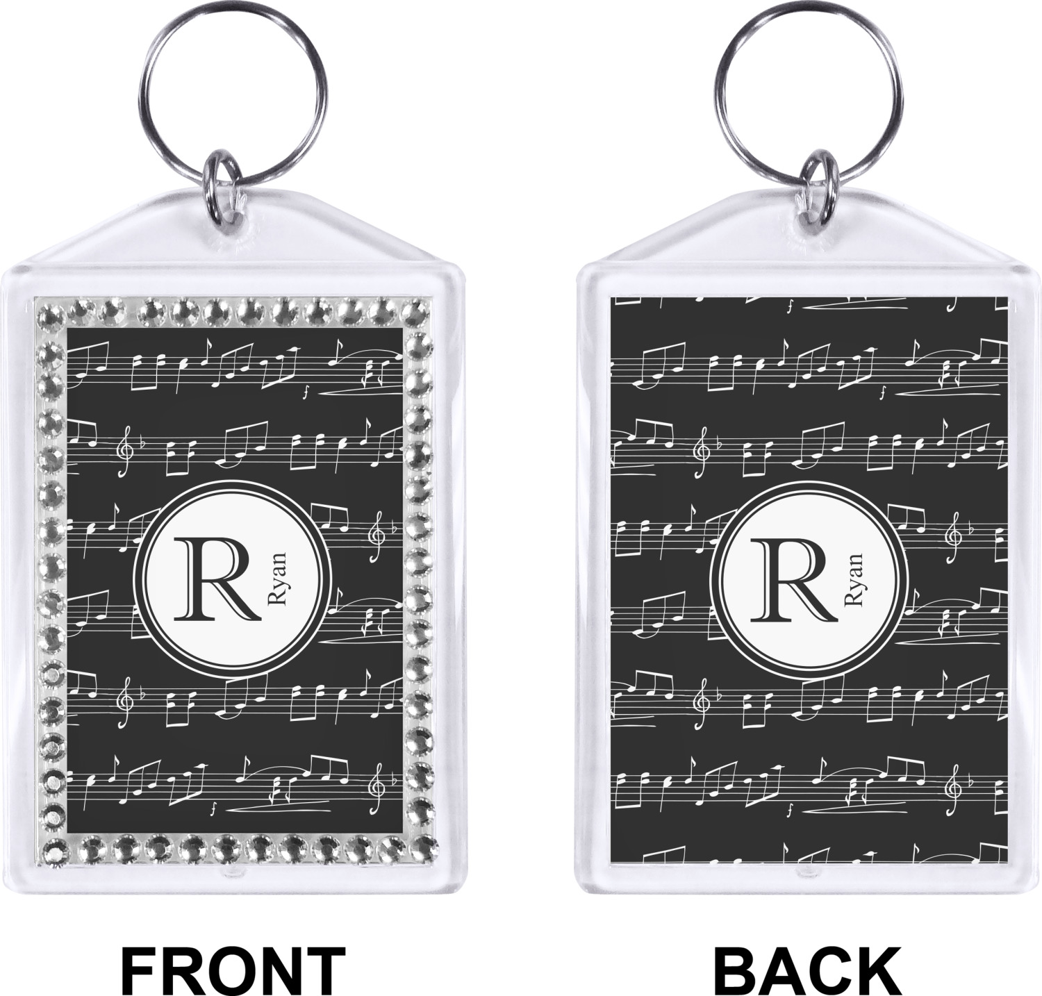 Our personalized keychains have a bold, rectangular shape, outlined by a series of shimmering rhinestones. A metal, split keyring is included with your purchase, and an additional metal hoop allows for attachment of the keychain to the split ring. This unique keychain measures at about 3.75 by 2.5 inches. We print your customized design(s) across both the back and front of this keychain.