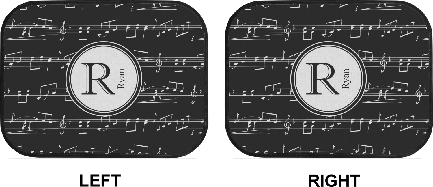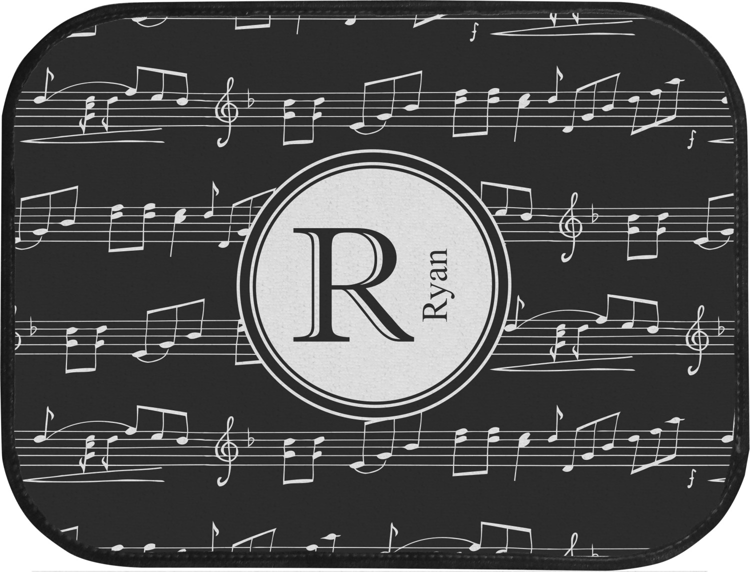 Music notes are set on a white background just like a sheet of music. A simple black outlined white label is placed in the middle of the design. Personalize with an initial and name of your choice.