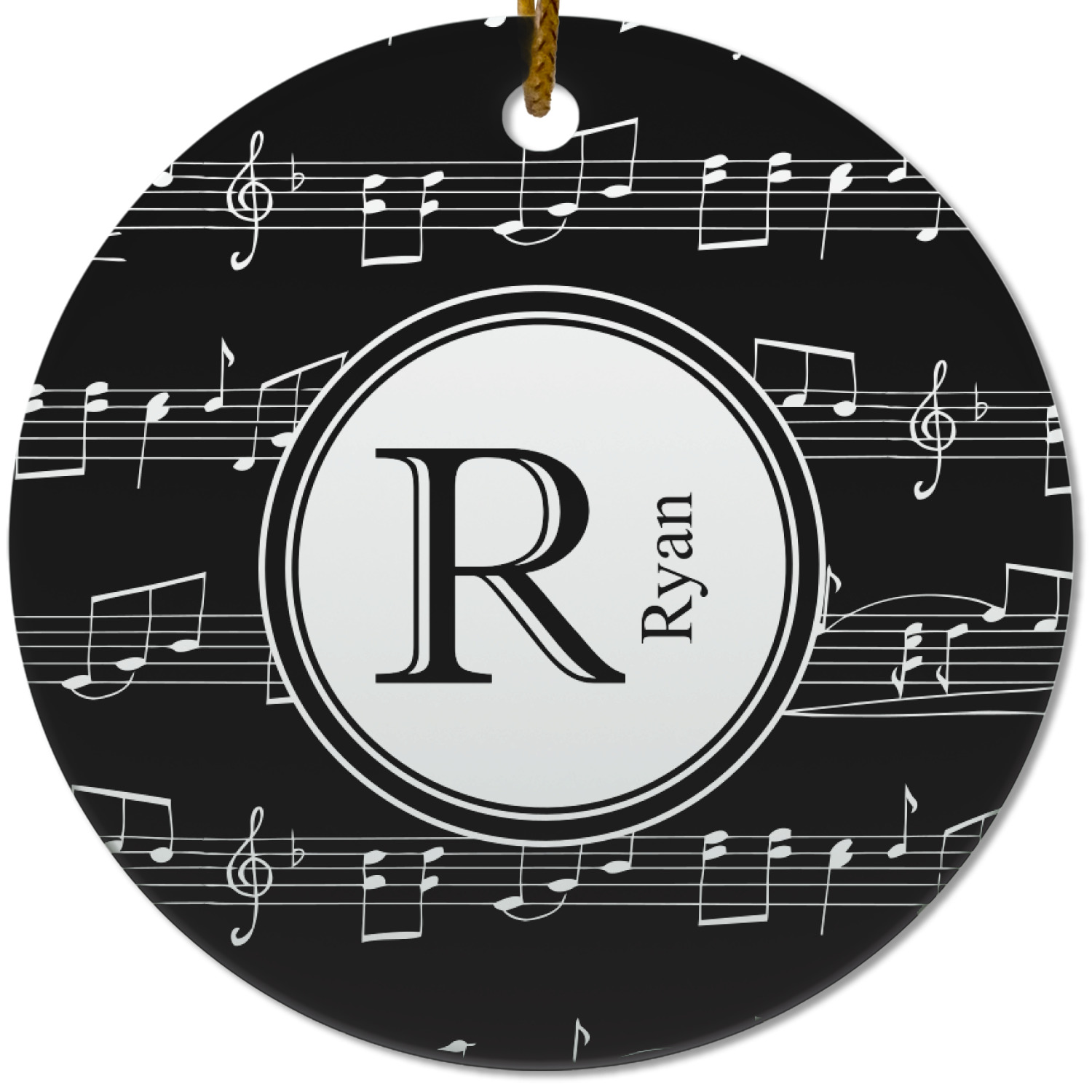 Music notes are set on a white background just like a sheet of music. A simple black outlined white label is placed in the middle of the design. Personalize with an initial and name of your choice.