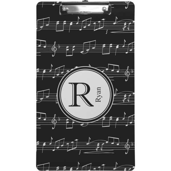 Music notes are set on a white background just like a sheet of music. A simple black outlined white label is placed in the middle of the design. Personalize with an initial and name of your choice.