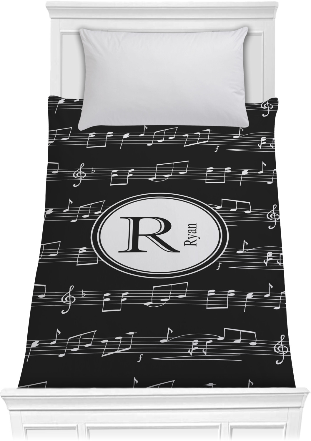 Music notes are set on a white background just like a sheet of music. A simple black outlined white label is placed in the middle of the design. Personalize with an initial and name of your choice.