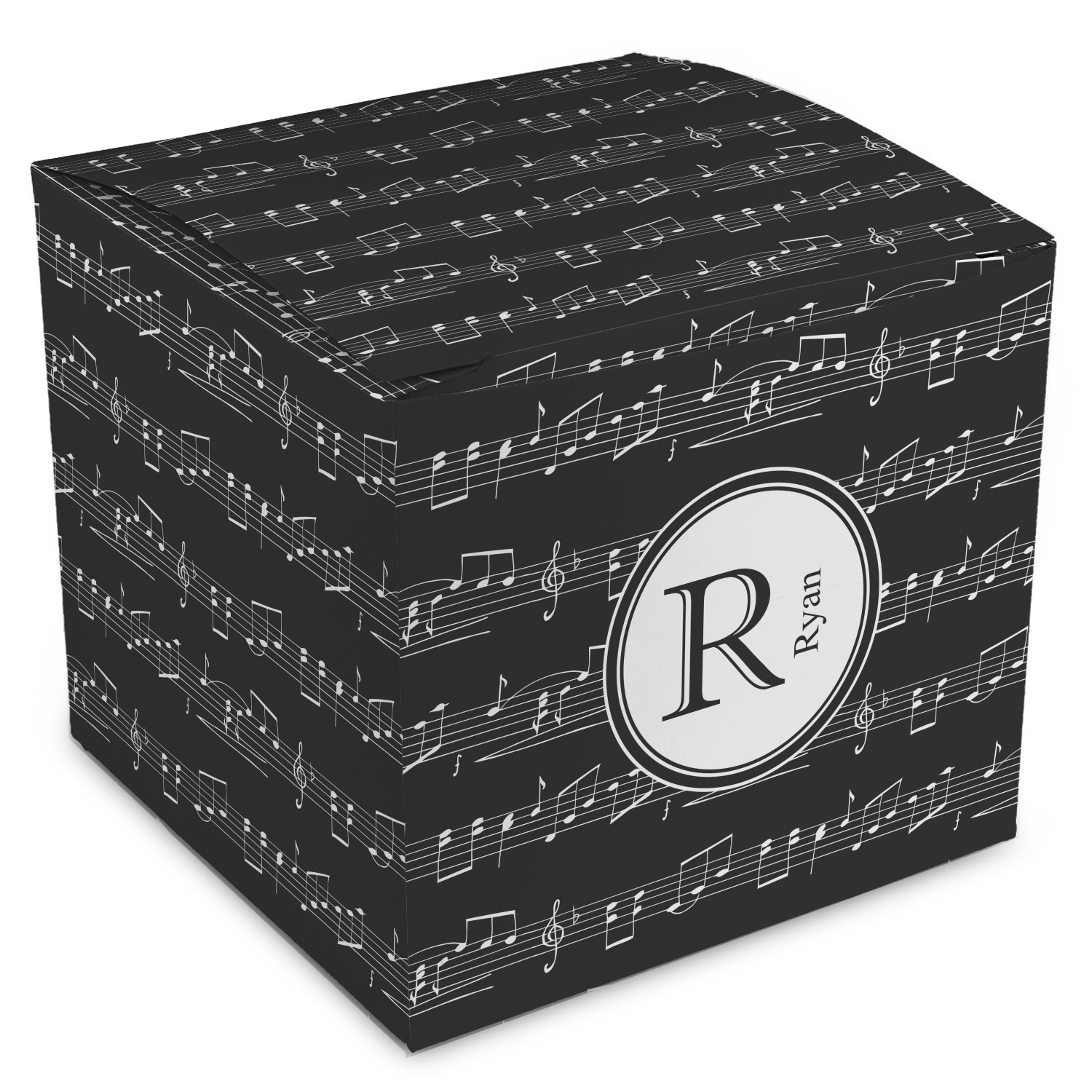 Music notes are set on a white background just like a sheet of music. A simple black outlined white label is placed in the middle of the design. Personalize with an initial and name of your choice.