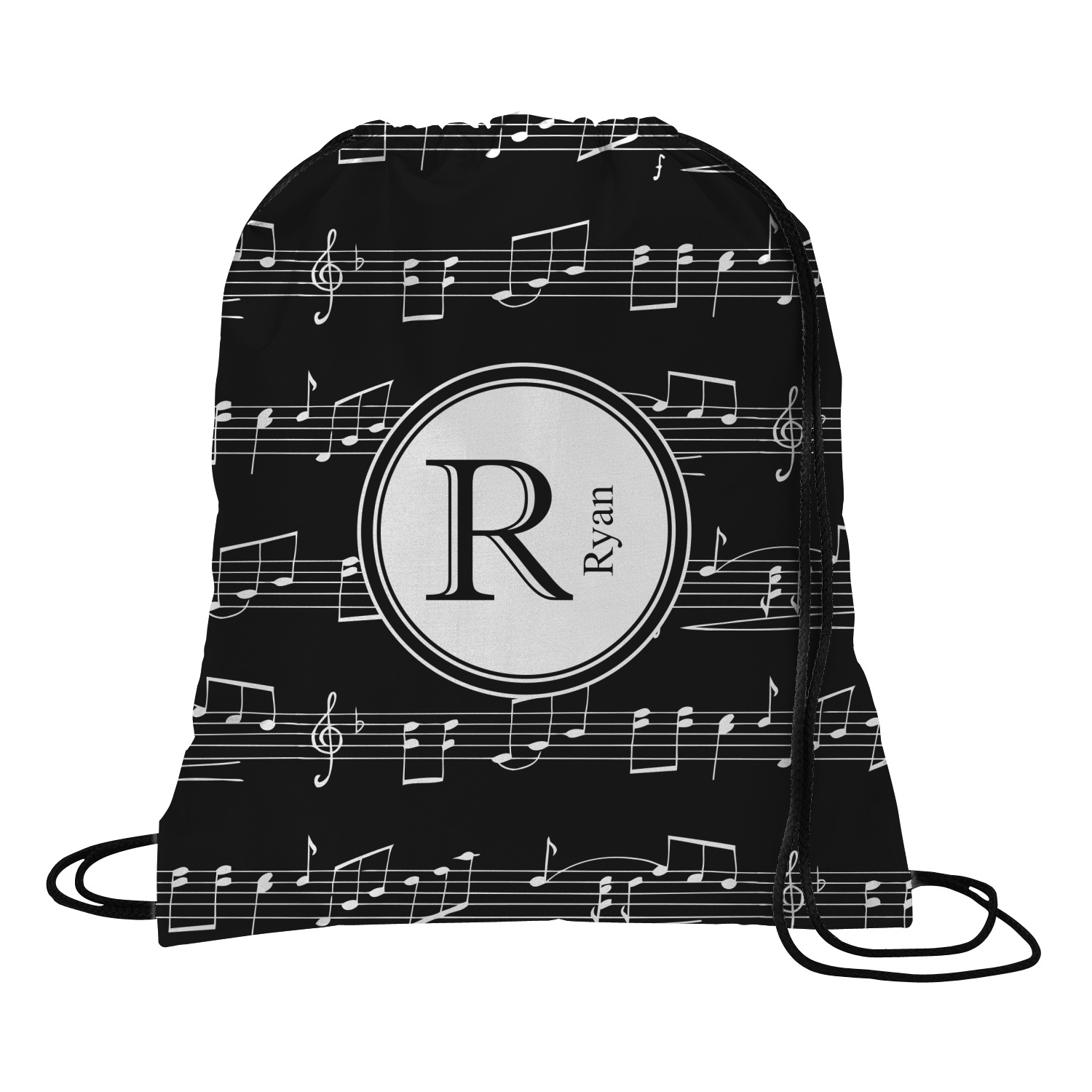 Music notes are set on a white background just like a sheet of music. A simple black outlined white label is placed in the middle of the design. Personalize with an initial and name of your choice.