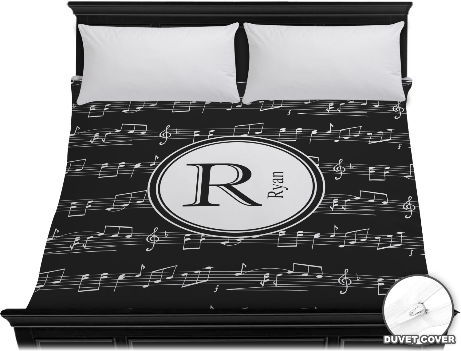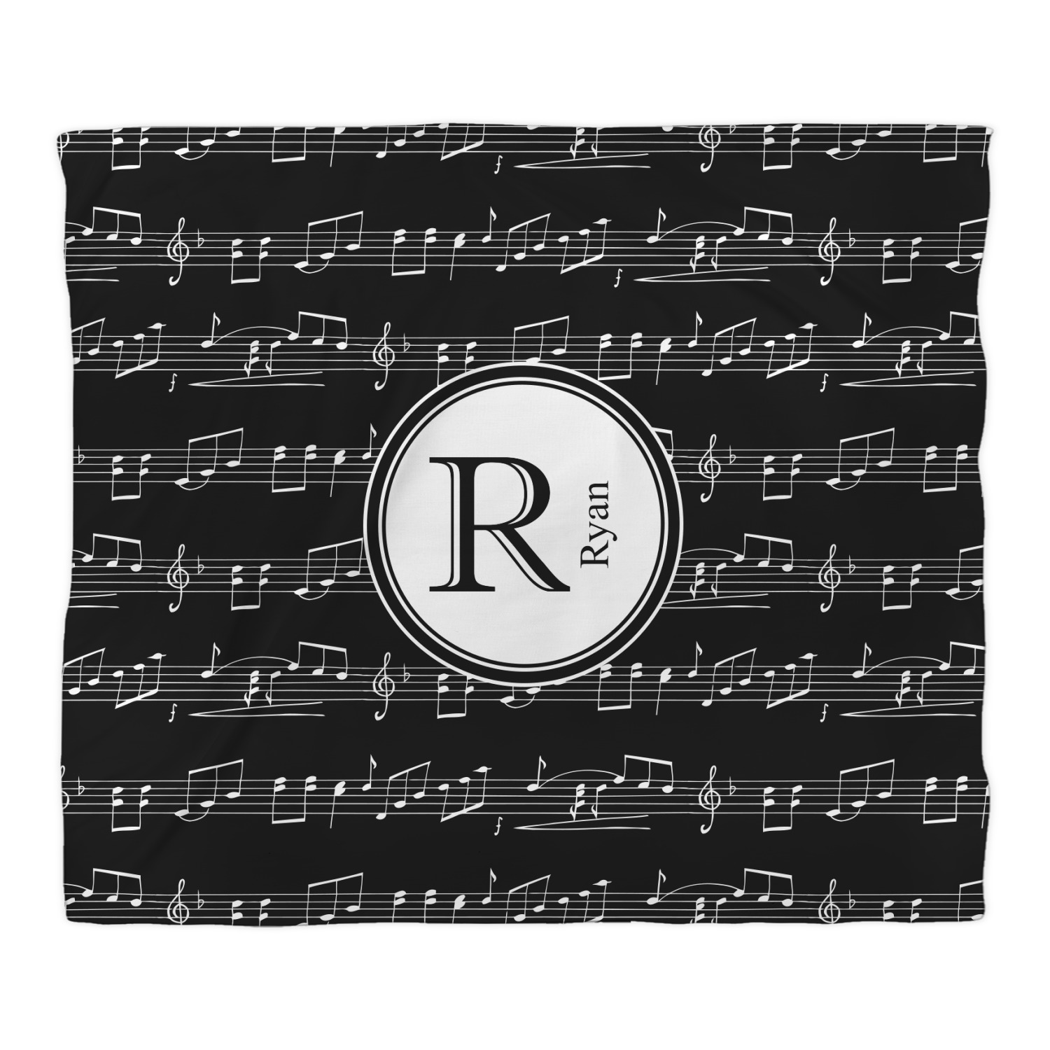 Music notes are set on a white background just like a sheet of music. A simple black outlined white label is placed in the middle of the design. Personalize with an initial and name of your choice.