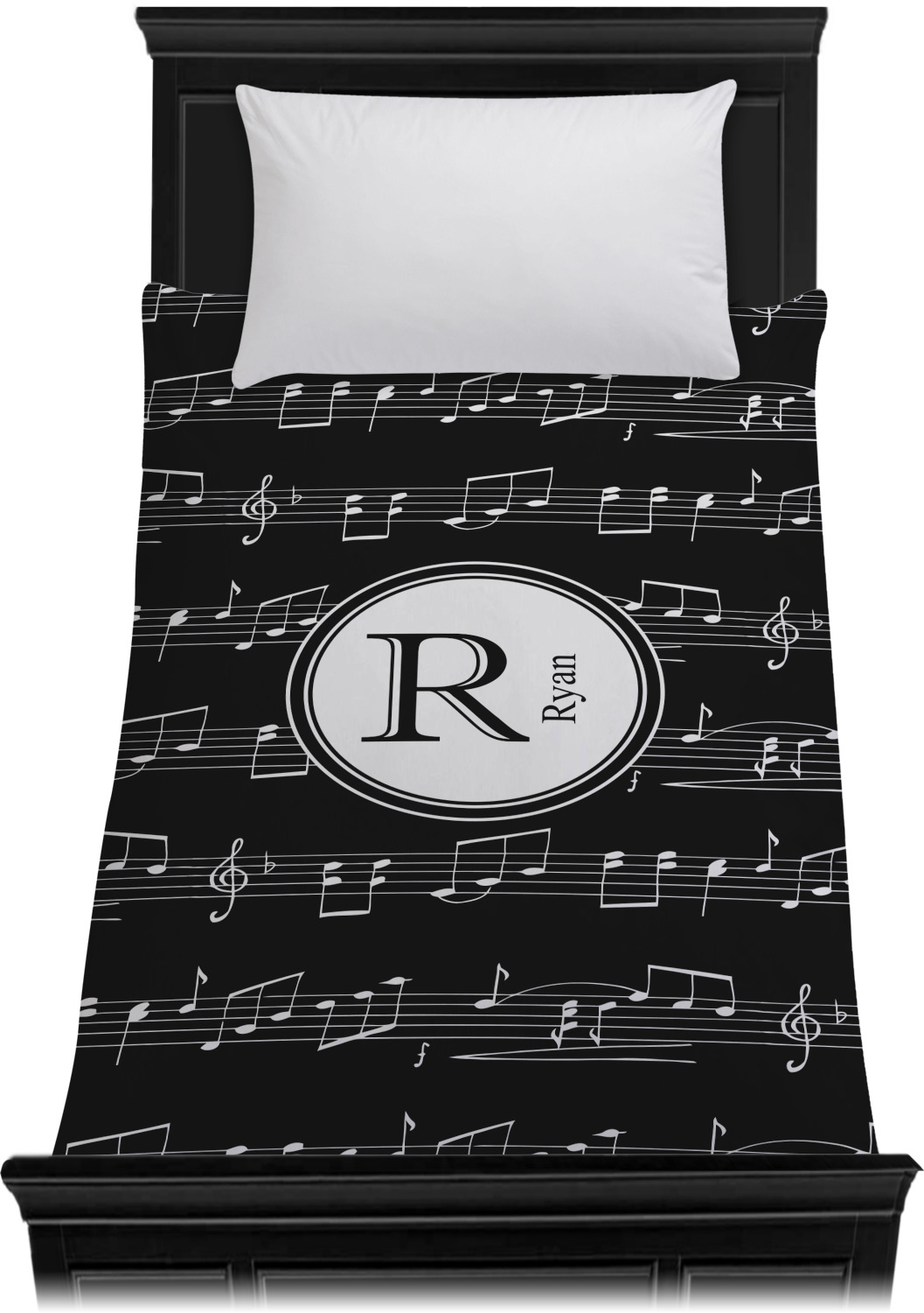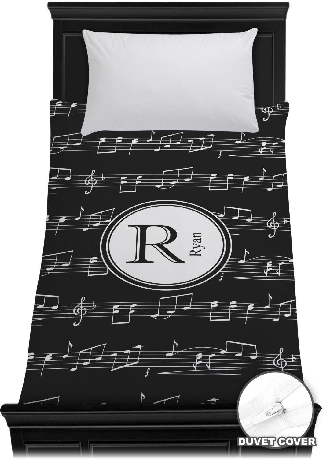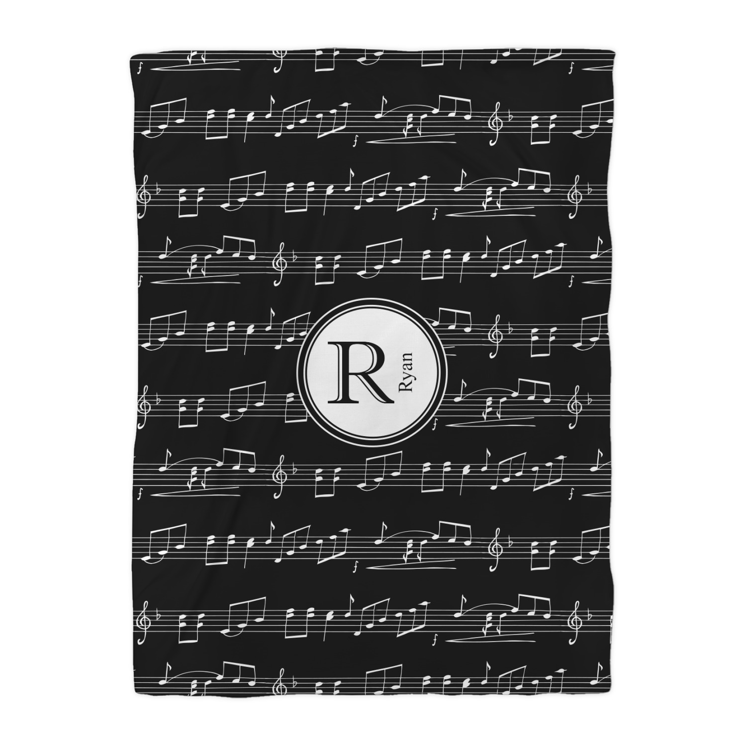 Music notes are set on a white background just like a sheet of music. A simple black outlined white label is placed in the middle of the design. Personalize with an initial and name of your choice.