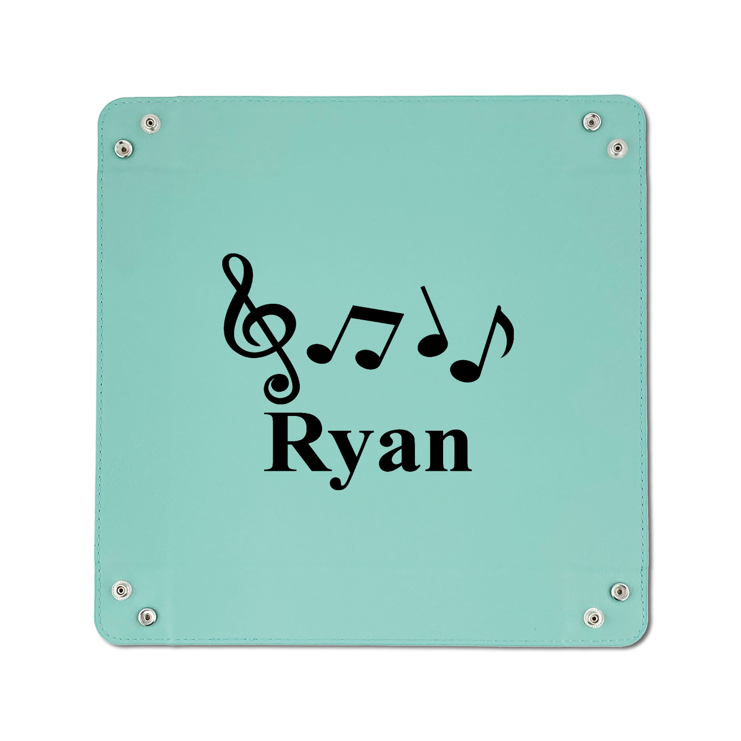 Music notes are set on a white background just like a sheet of music. A simple black outlined white label is placed in the middle of the design. Personalize with an initial and name of your choice.