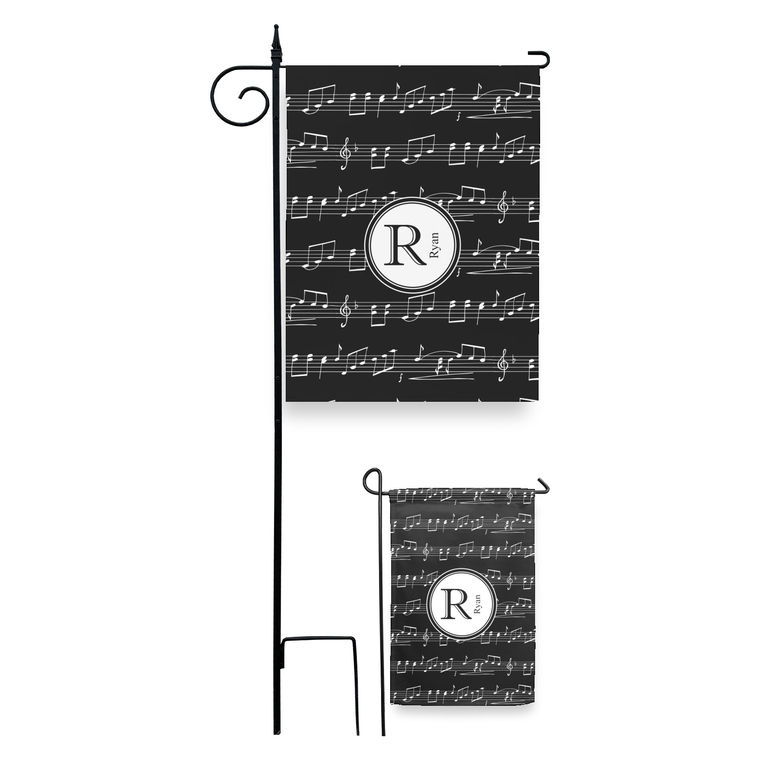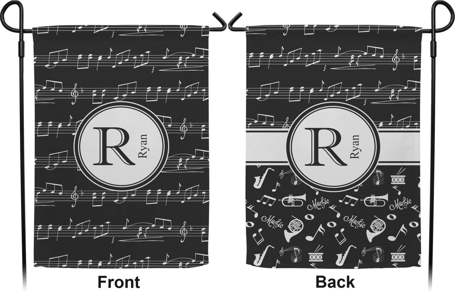 Music notes are set on a white background just like a sheet of music. A simple black outlined white label is placed in the middle of the design. Personalize with an initial and name of your choice.