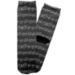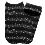 Music notes are set on a white background just like a sheet of music. A simple black outlined white label is placed in the middle of the design. Personalize with an initial and name of your choice.