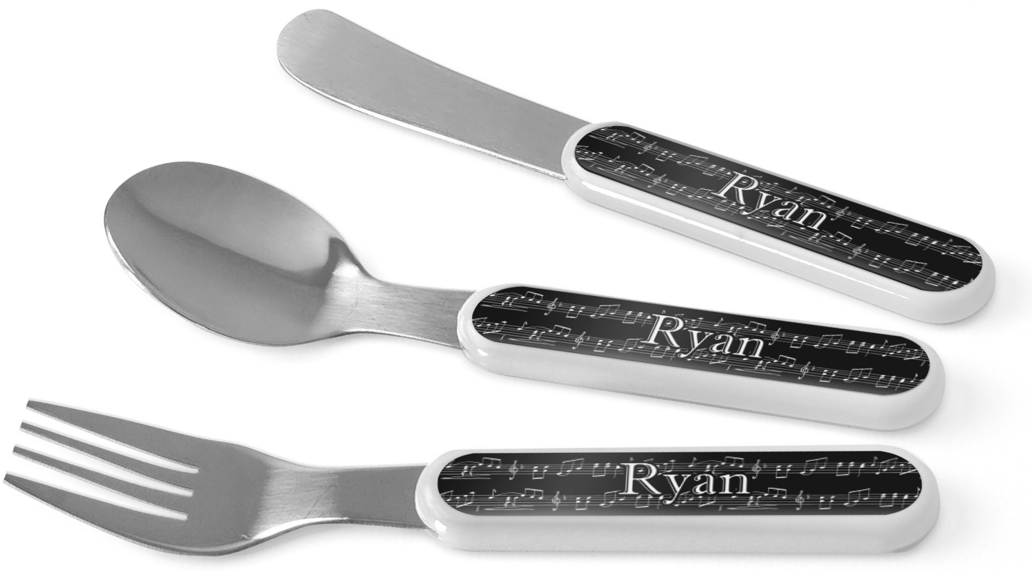This set of kids' silverware includes a 5.5 inch spoon, fork, and knife, catered to your little one's needs. The prongs of this fork are flat and dull, while our spoon is small enough for tiny mouths, and the dullness of the knife itself resembles a butter knife, at most. These kids' utensils are made of stainless steel, while the handles are crafted from a durable plastic that will withstand the energy and use of your young one. We print your customization across the handles, making the cutlery set unique to your child only.