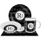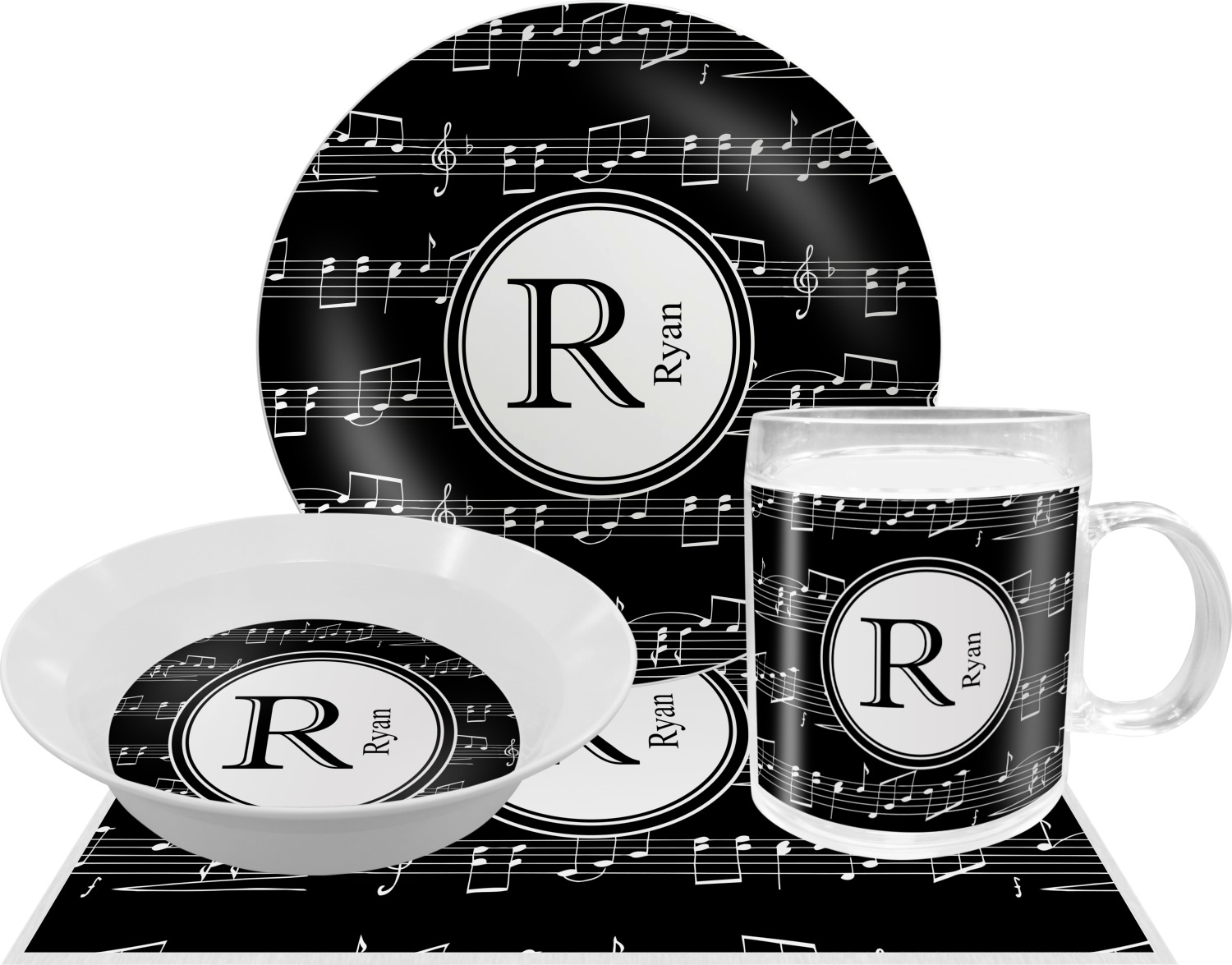 Music notes are set on a white background just like a sheet of music. A simple black outlined white label is placed in the middle of the design. Personalize with an initial and name of your choice.