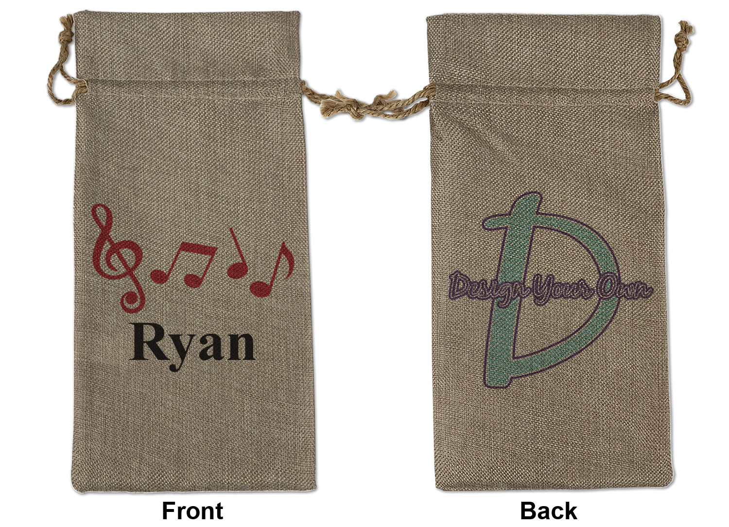 We sell our Burlap Gift Bags in 3 variant sized bags. Made with burlap polyester, each personalized bag can be secured with a twine drawstring pull. Your custom design is available to print on one side or both sides - completely up to you! The sizes of the bags measure approximately 4.5" x 6.5" for the smallest size, 6.5" x 8.0" for the medium size, and 6.5" x 13.5" for the large-sized bag.