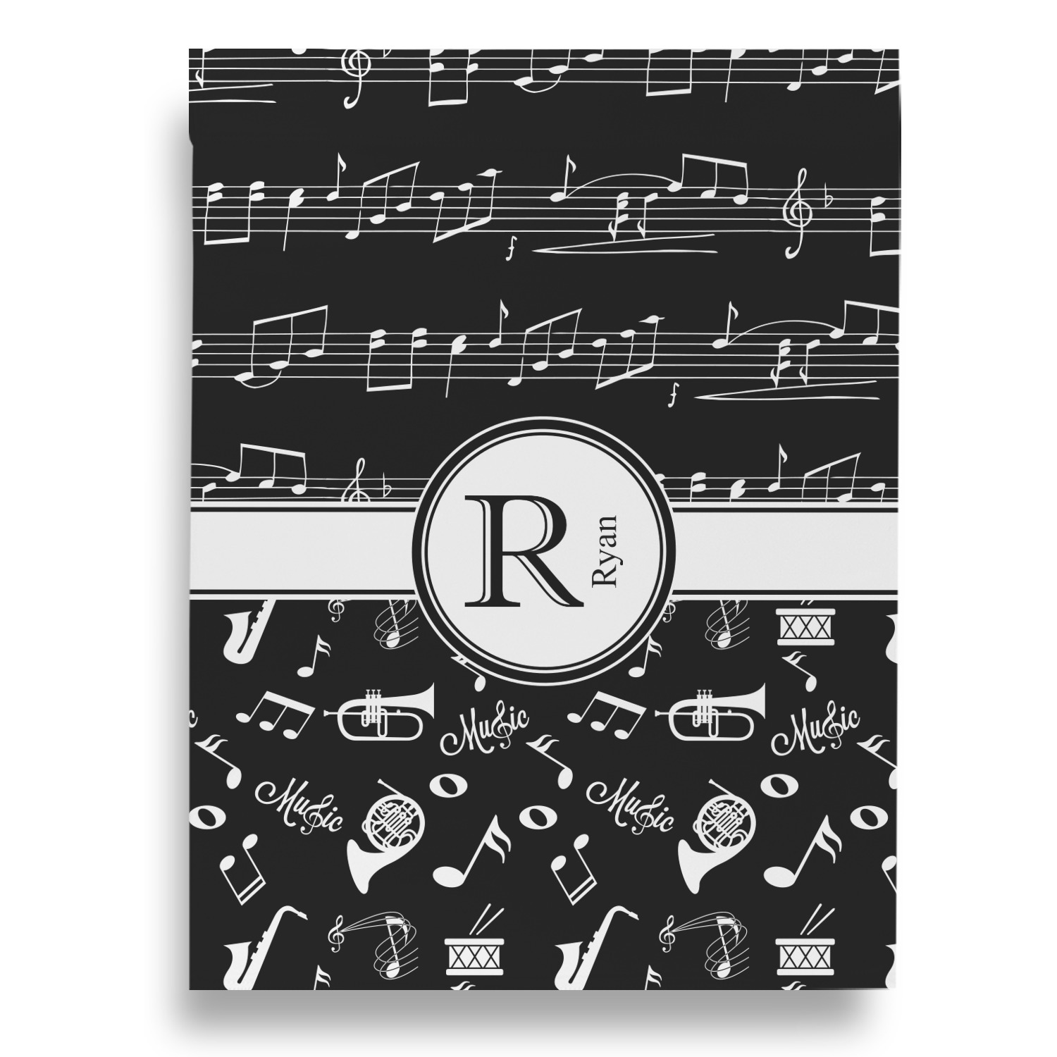 Music notes are set on a white background just like a sheet of music. A simple black outlined white label is placed in the middle of the design. Personalize with an initial and name of your choice.