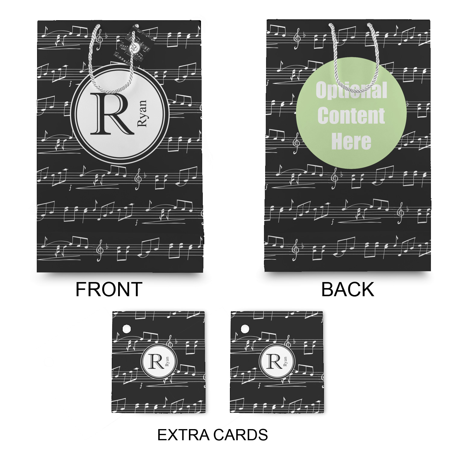 Music notes are set on a white background just like a sheet of music. A simple black outlined white label is placed in the middle of the design. Personalize with an initial and name of your choice.