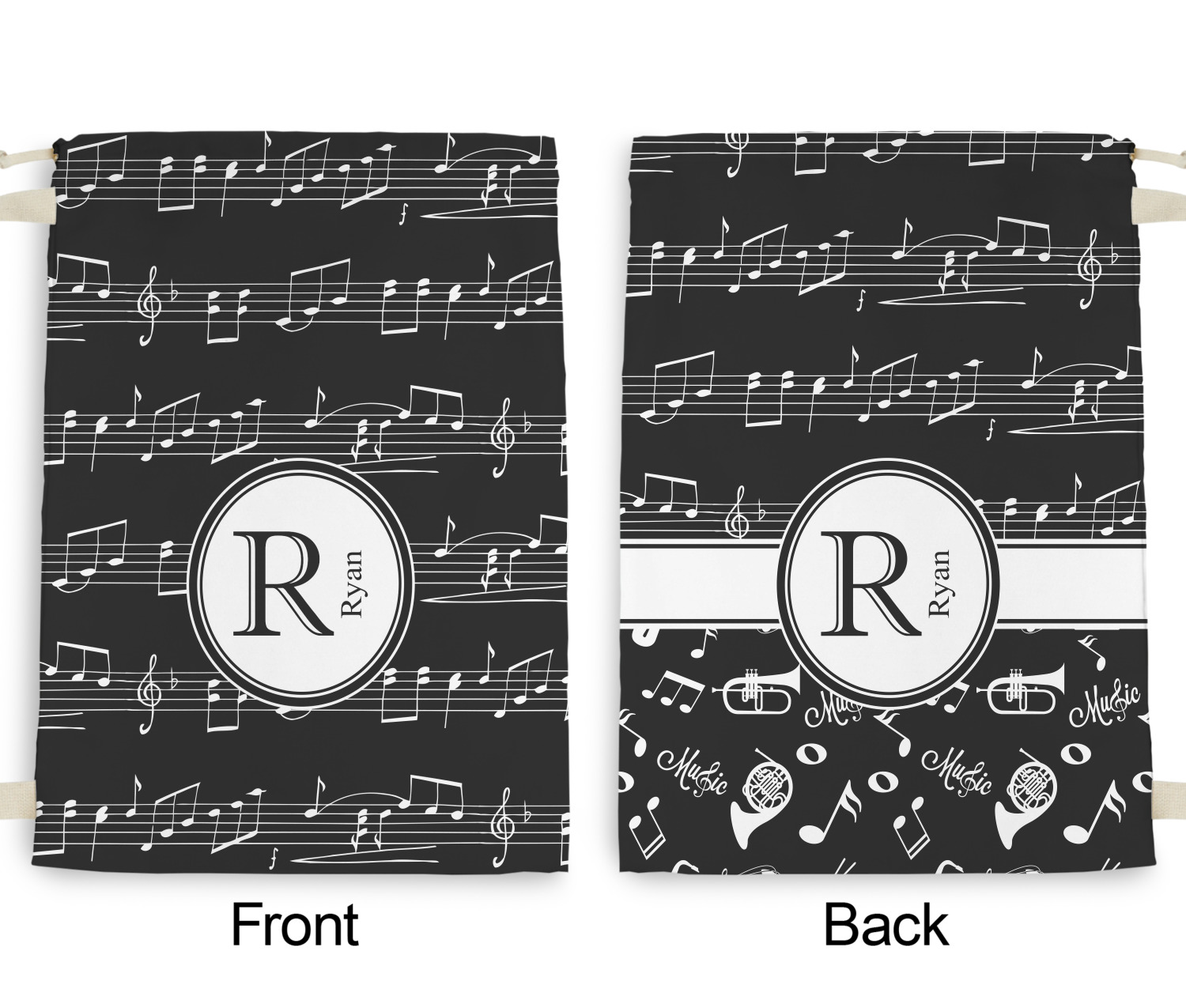 Music notes are set on a white background just like a sheet of music. A simple black outlined white label is placed in the middle of the design. Personalize with an initial and name of your choice.