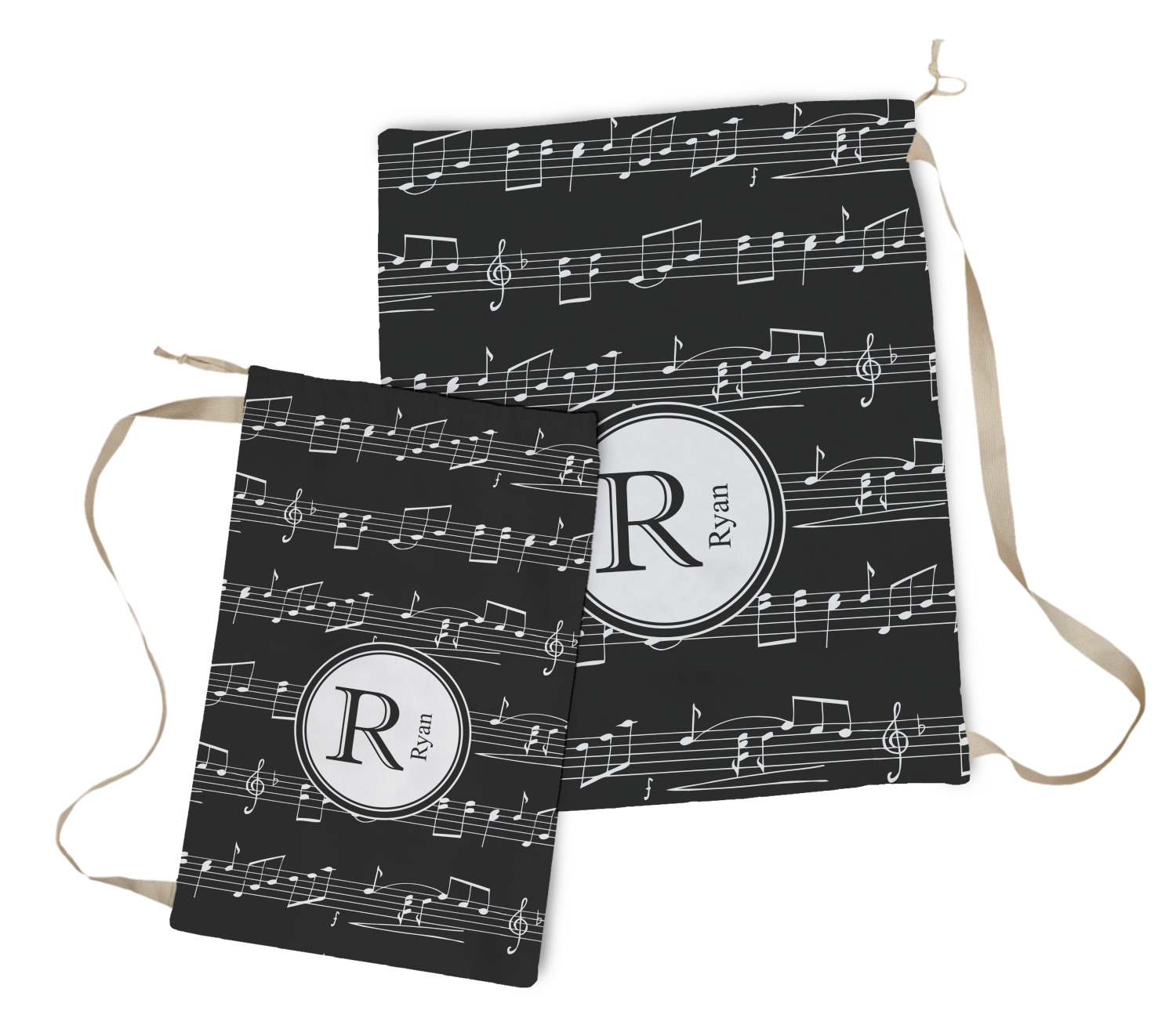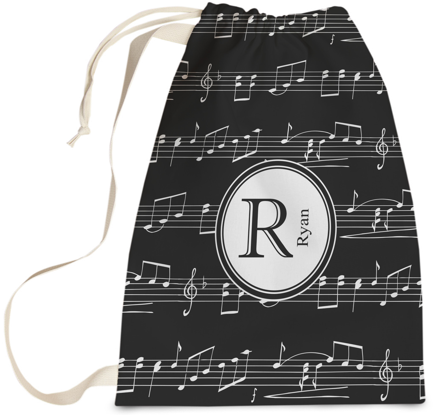 Music notes are set on a white background just like a sheet of music. A simple black outlined white label is placed in the middle of the design. Personalize with an initial and name of your choice.