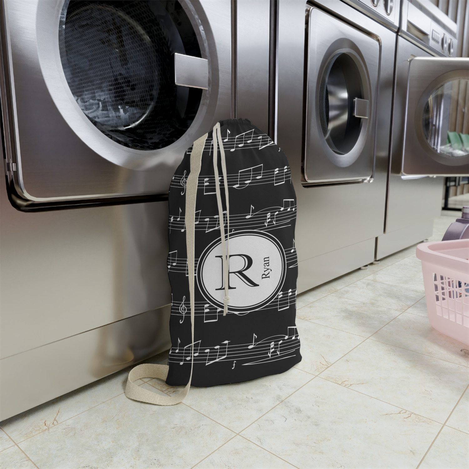 Carry your laundry in style with these customized laundry bags. Available in two sizes, featuring a natural colored woven strap and a cinch cord, these bags hold a lot of clothes or anything else you want to fit in them.