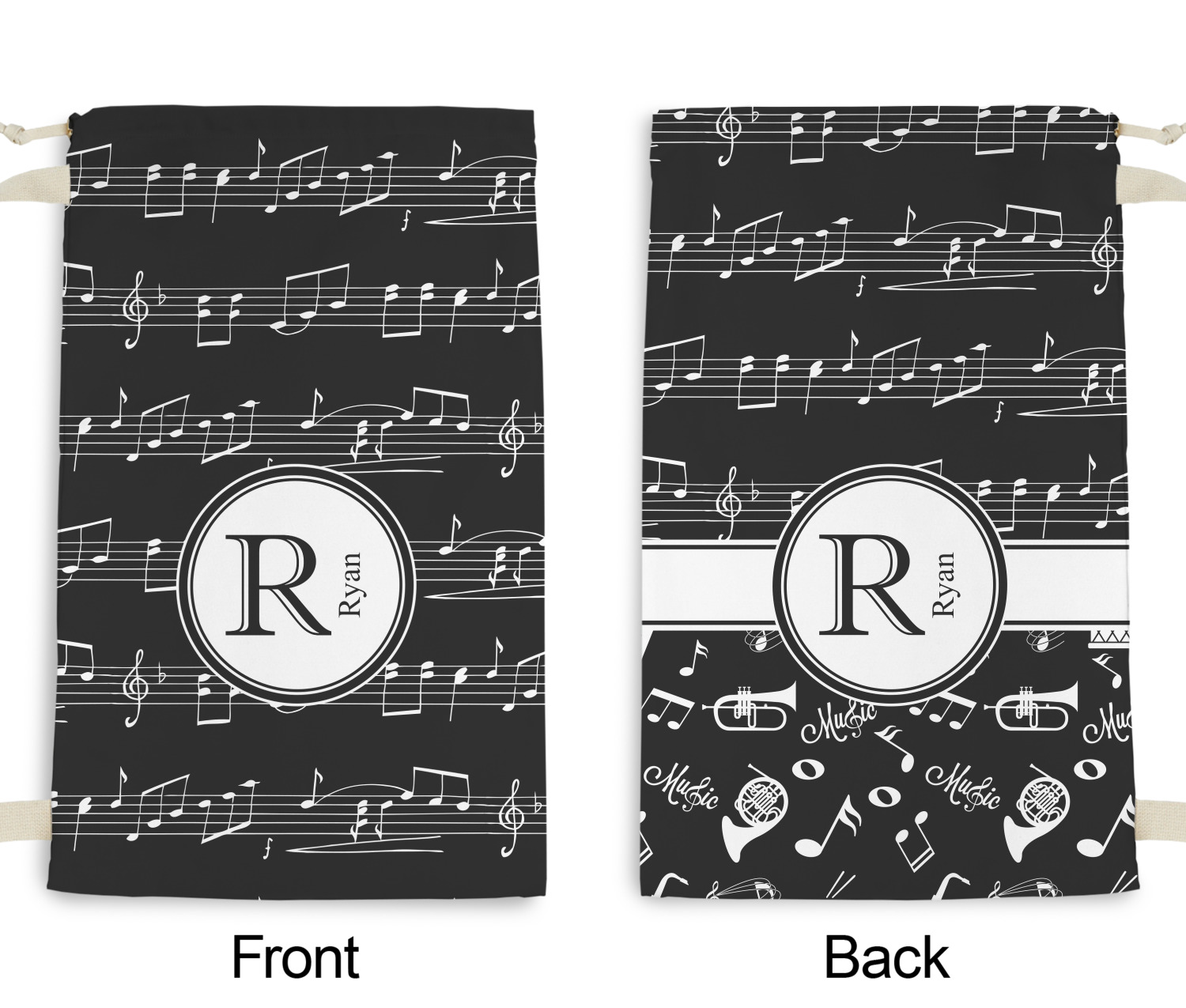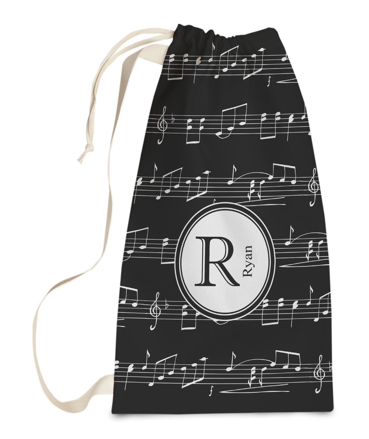 Music notes are set on a white background just like a sheet of music. A simple black outlined white label is placed in the middle of the design. Personalize with an initial and name of your choice.