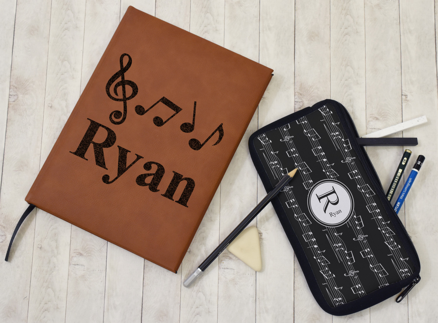 Music notes are set on a white background just like a sheet of music. A simple black outlined white label is placed in the middle of the design. Personalize with an initial and name of your choice.