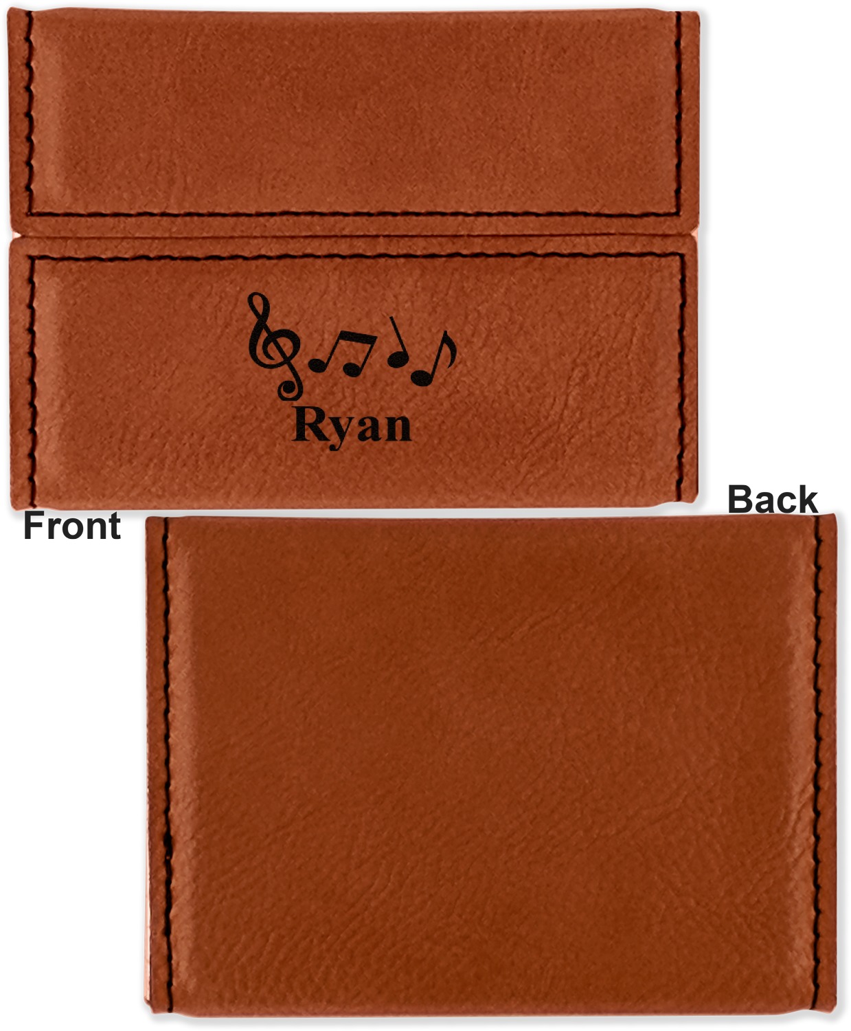 Your personalized design is laser engraved onto either the front, or the front and back of the card holder, depending on the model you purchase. Once engraved, the design will appear a darkened black against the cognac color of the leatherette.