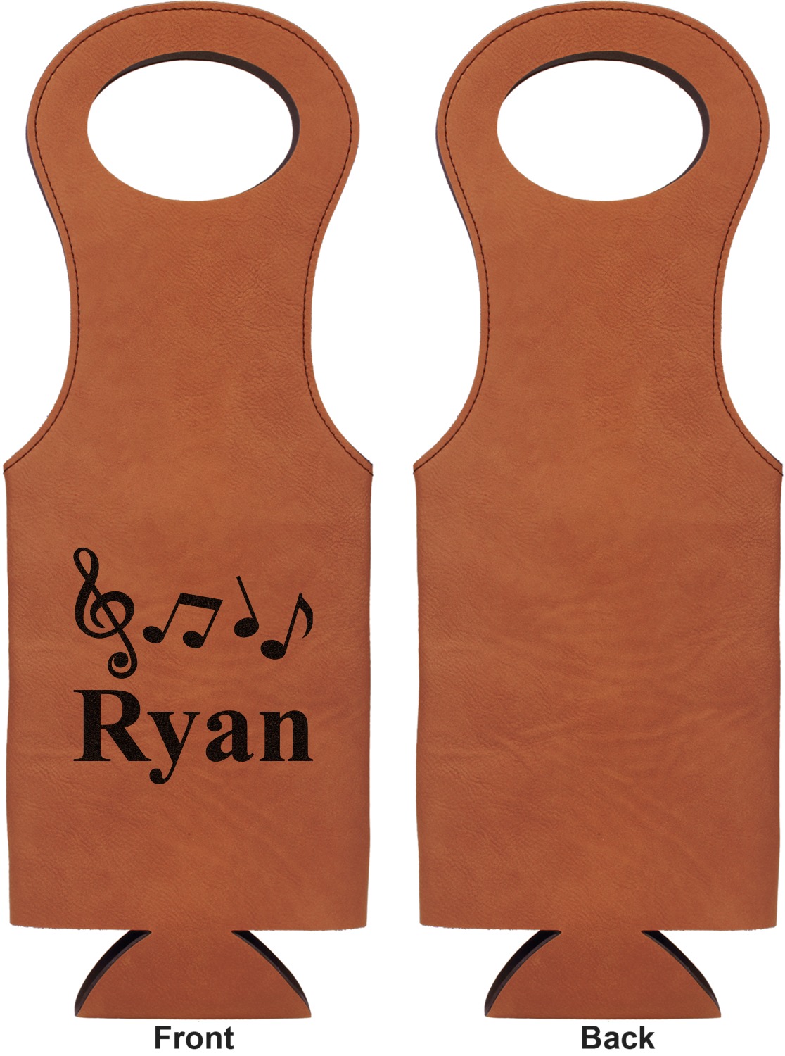 This wine carrier is made from a stunning leatherette, in a cognac-brown color. Strong, black stitching lines the sides of your wine bottle bag and provides extra durability. The interior is lined with a padded, black material to allow for a snug fit once your bottle is placed inside. At the top of this wine gift bag, you'll find two oval shaped handles that elegantly complements the rest of the bag's style. We provide you with the option of laser-engraving the front, or the front and back of your new personalized wine bag!