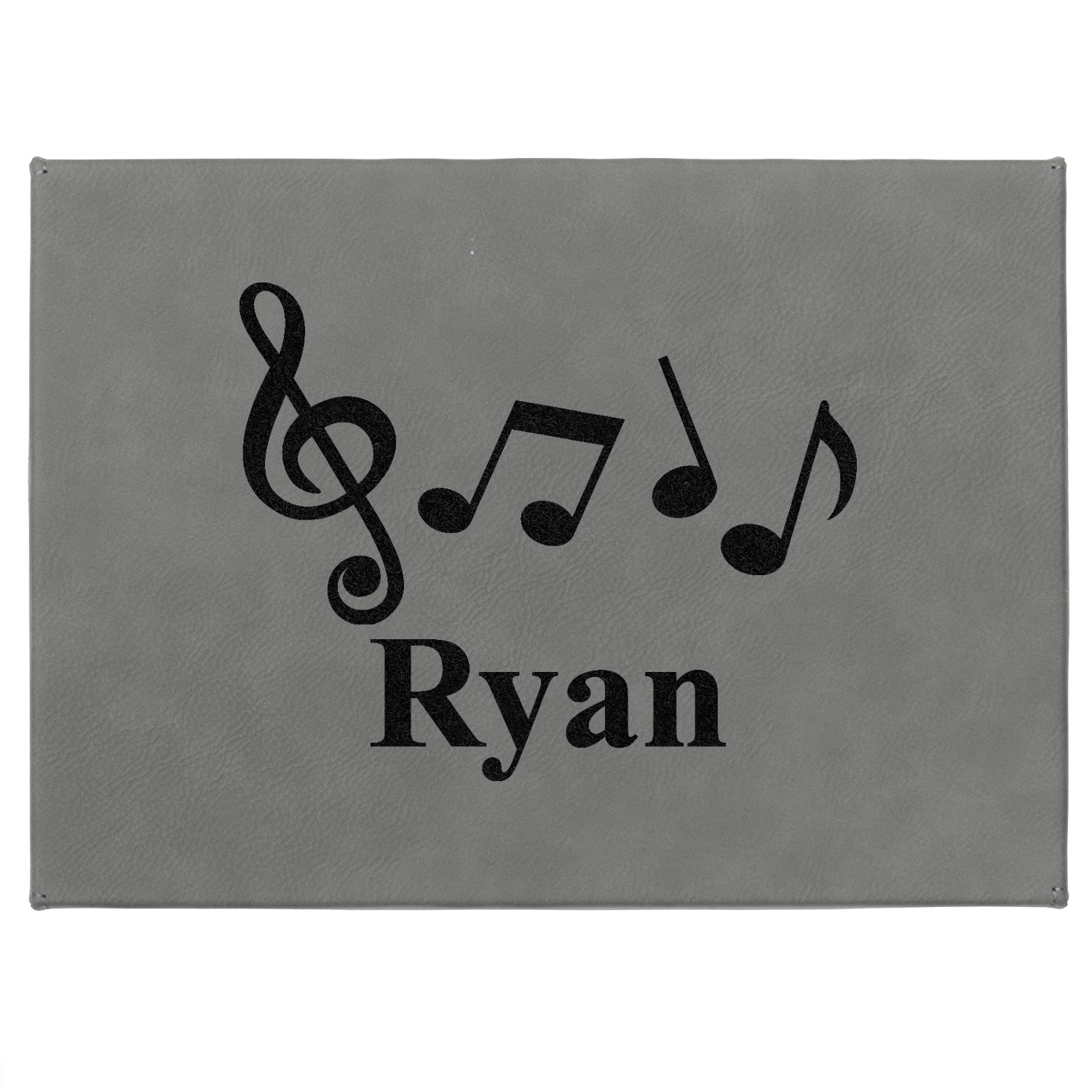 Music notes are set on a white background just like a sheet of music. A simple black outlined white label is placed in the middle of the design. Personalize with an initial and name of your choice.