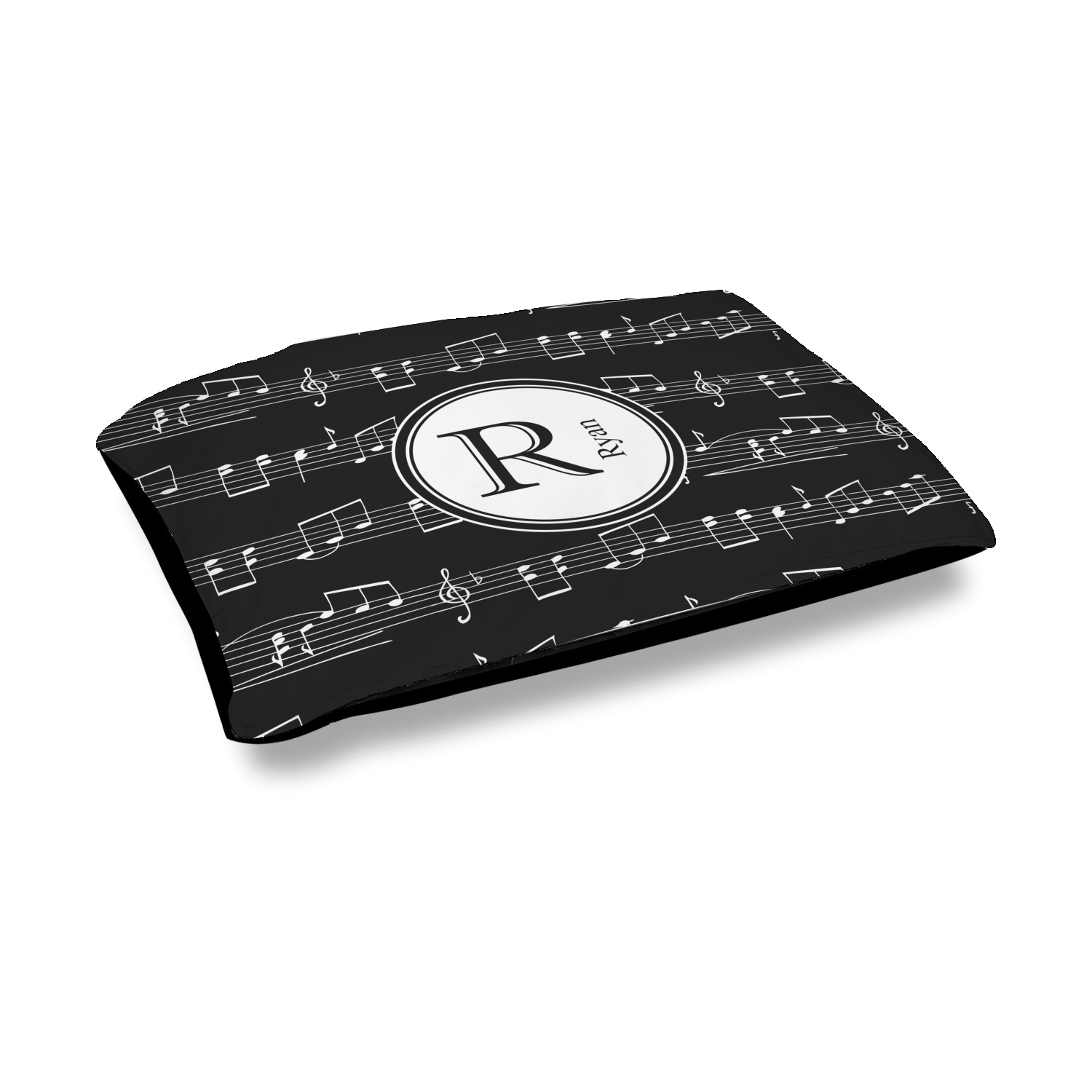 Music notes are set on a white background just like a sheet of music. A simple black outlined white label is placed in the middle of the design. Personalize with an initial and name of your choice.