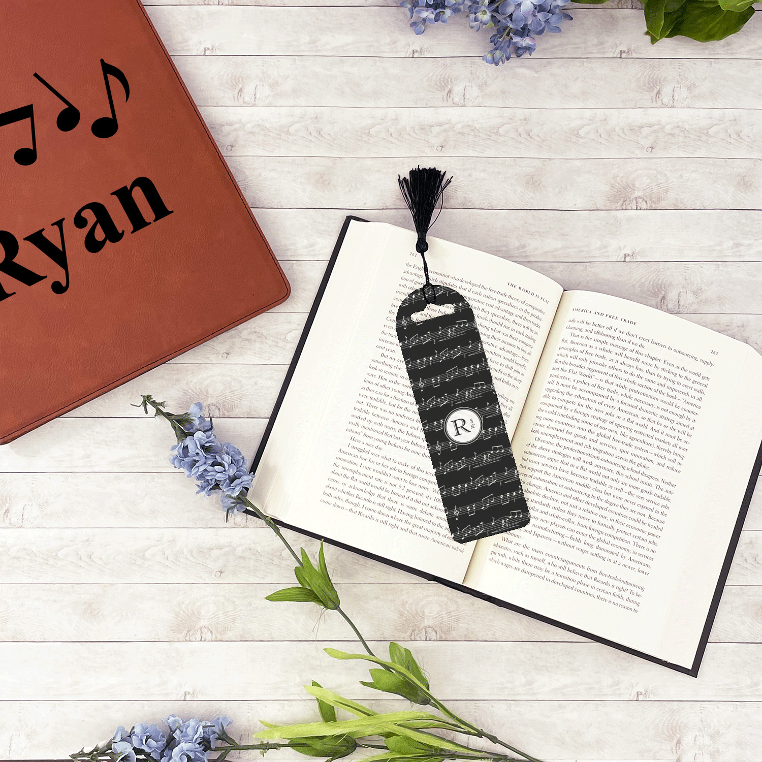 Music notes are set on a white background just like a sheet of music. A simple black outlined white label is placed in the middle of the design. Personalize with an initial and name of your choice.