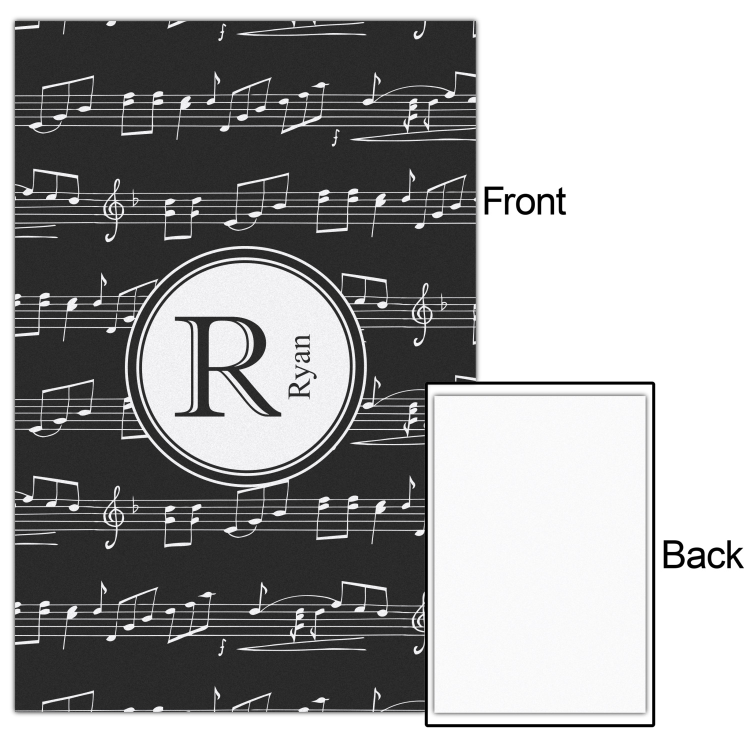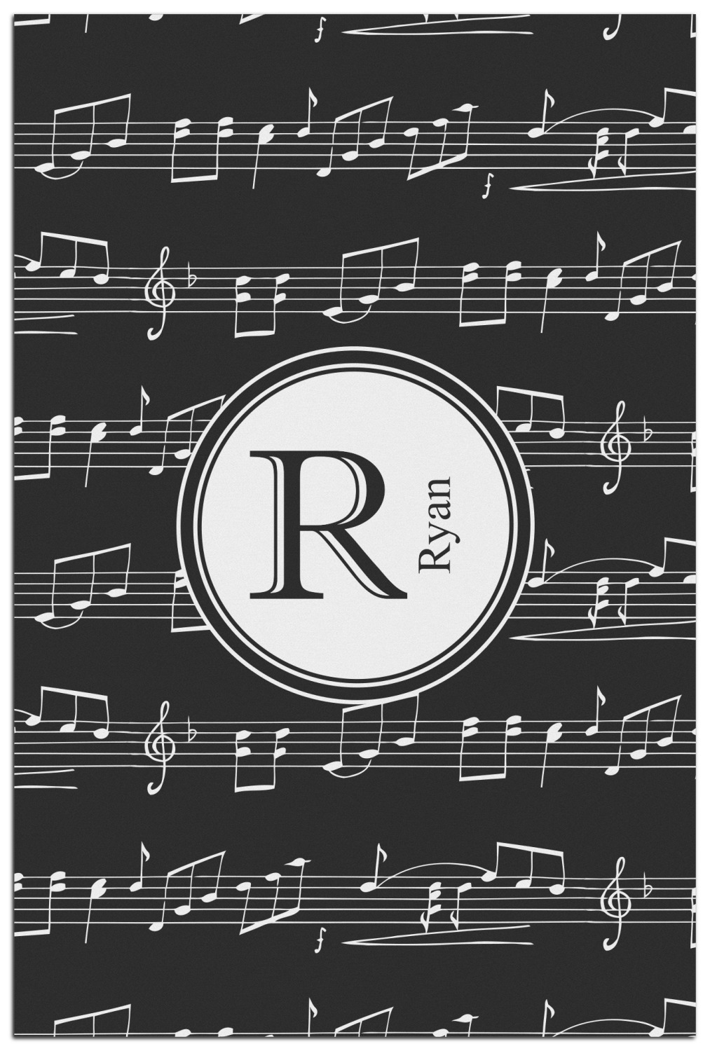 Music notes are set on a white background just like a sheet of music. A simple black outlined white label is placed in the middle of the design. Personalize with an initial and name of your choice.