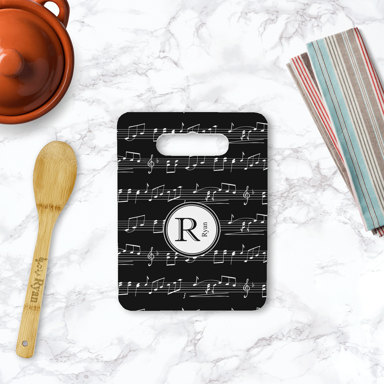Music notes are set on a white background just like a sheet of music. A simple black outlined white label is placed in the middle of the design. Personalize with an initial and name of your choice.