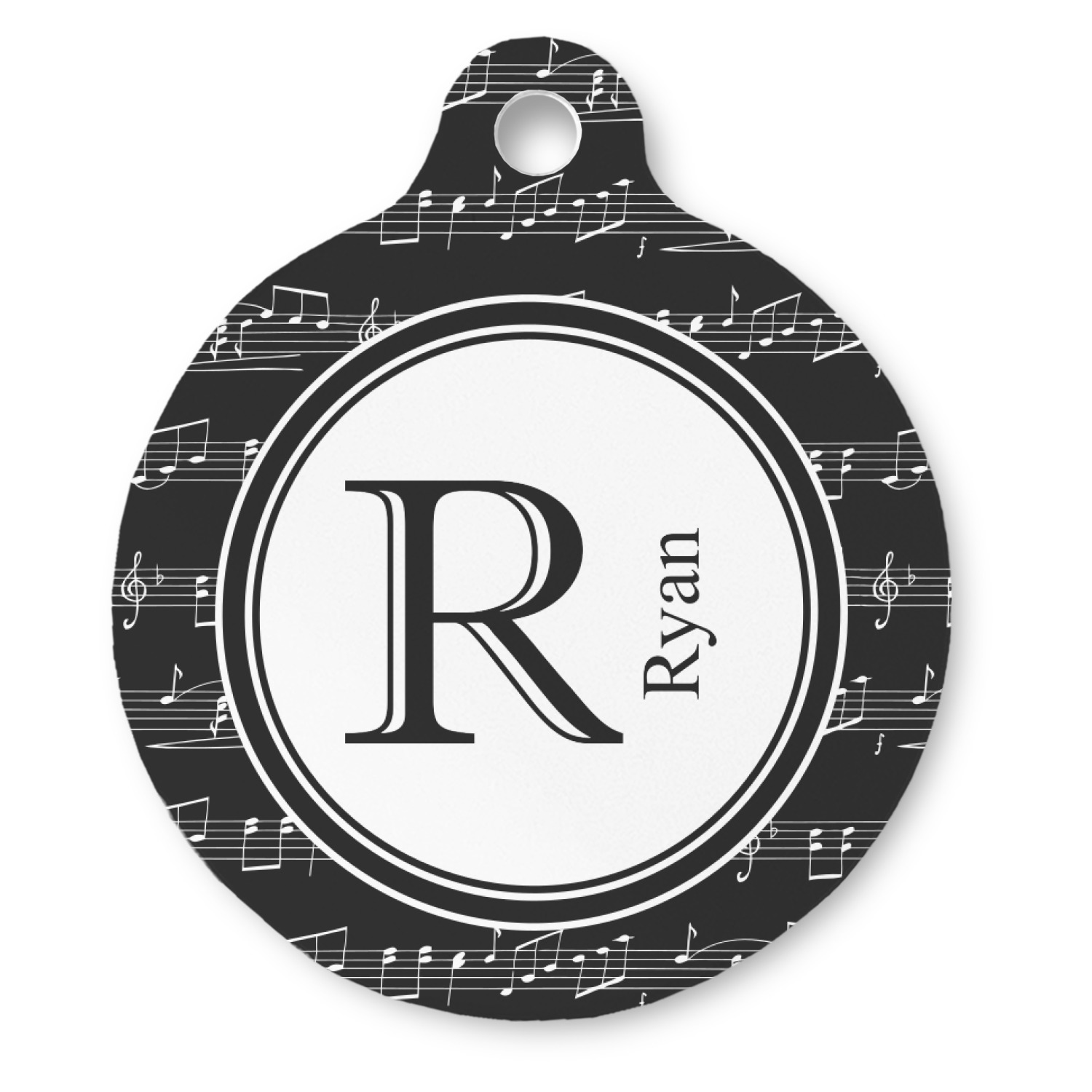 Music notes are set on a white background just like a sheet of music. A simple black outlined white label is placed in the middle of the design. Personalize with an initial and name of your choice.