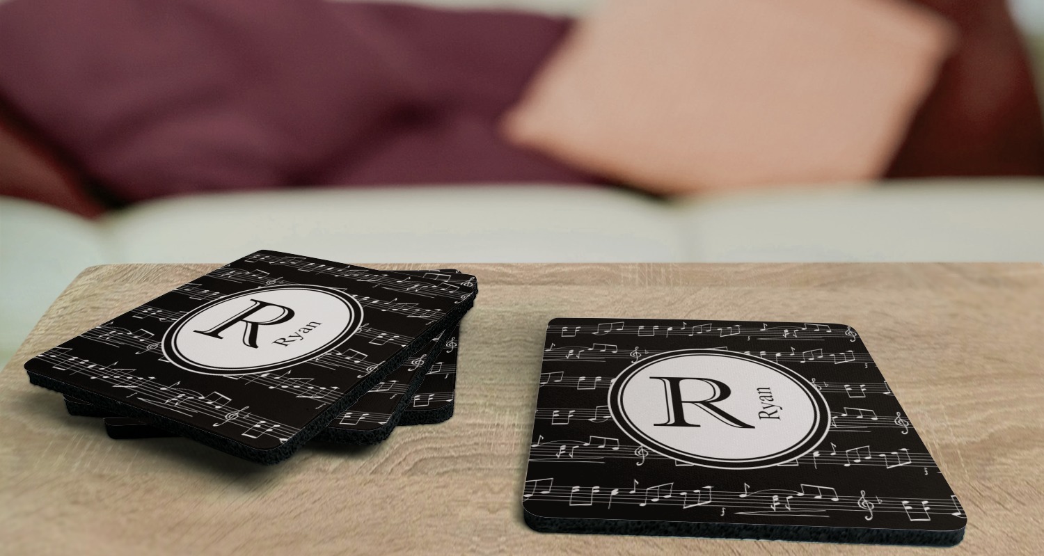 These drink coasters have a smooth, polyester top and a textured, rubber backing on its bottom. The non-slip rubber backing underneath works to keep any spills at bay. At 4 by 4 by 0.25 inches thick, these custom coasters are a suitable size for most drinkware. Your personalization is displayed atop the face of the cup coaster. We sell these rubber coasters in two different shapes: square and round. You can buy each shape as singulars or as a set of 4.