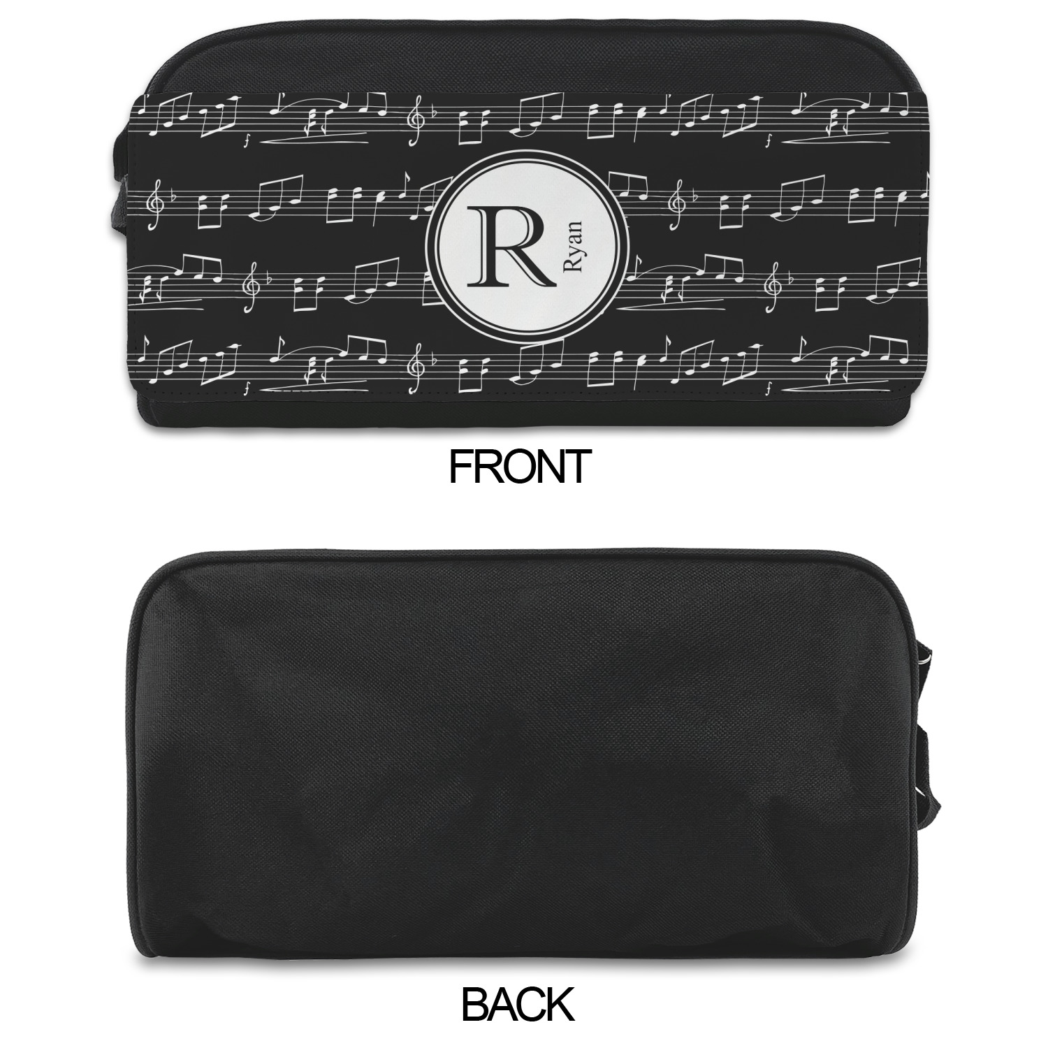 Music notes are set on a white background just like a sheet of music. A simple black outlined white label is placed in the middle of the design. Personalize with an initial and name of your choice.