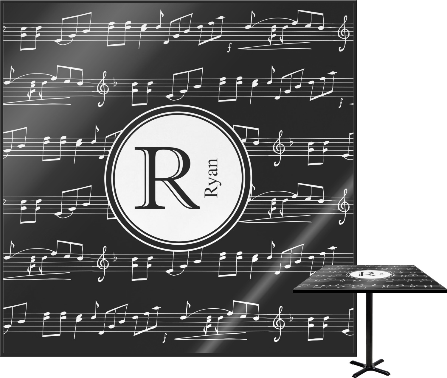 Music notes are set on a white background just like a sheet of music. A simple black outlined white label is placed in the middle of the design. Personalize with an initial and name of your choice.