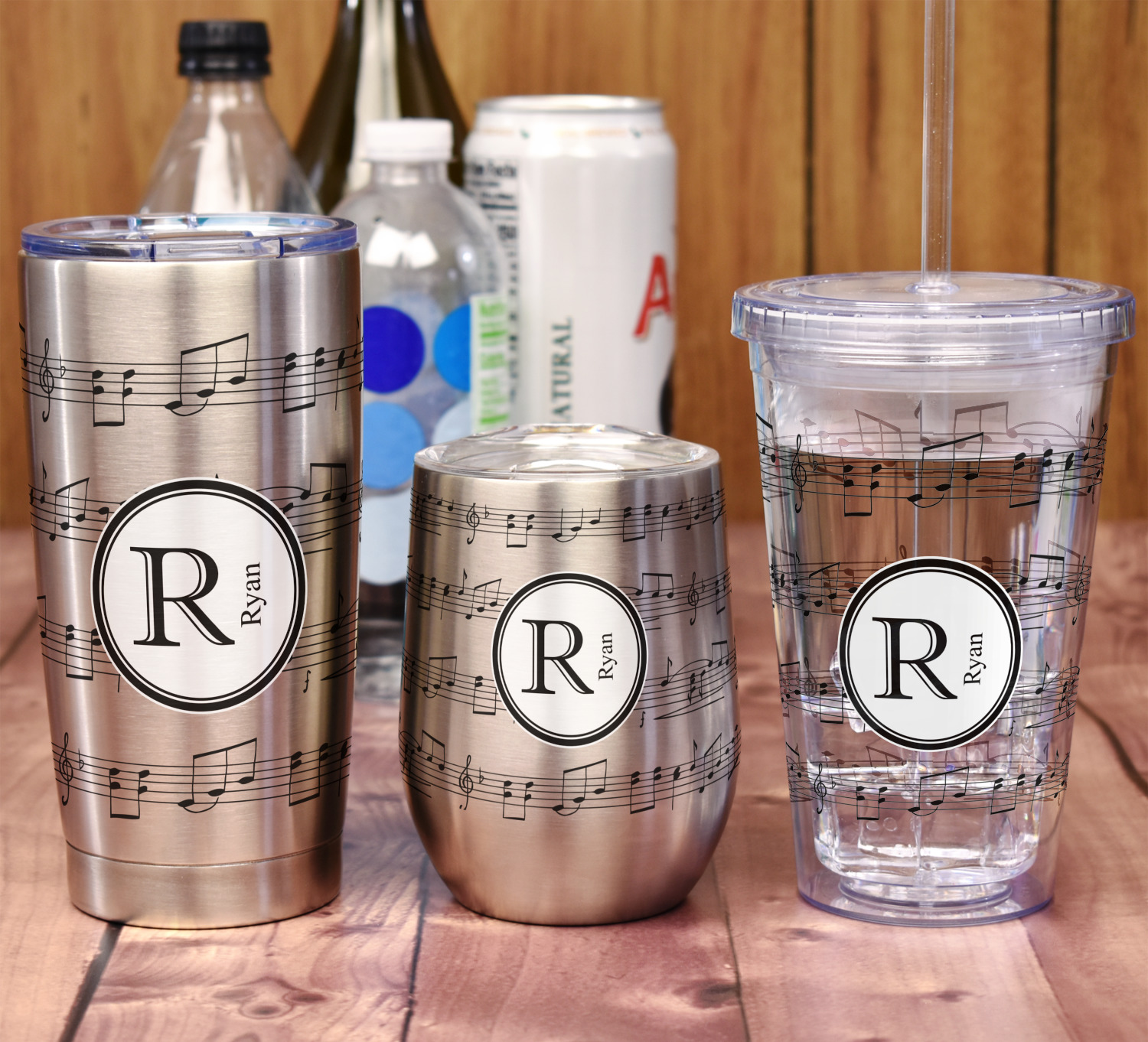 Music notes are set on a white background just like a sheet of music. A simple black outlined white label is placed in the middle of the design. Personalize with an initial and name of your choice.